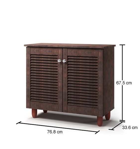The Essentials Shoe Storage Cabinet is a modern design Cabinet in Wenge finish with metal handles. Keep your bits and bobs tidy and organised with this cupboard. Suitable for use in your Hallway, Bathroom, Living Room or Home Office. Complete with 2 doors and fixed shelves behind. Traditional Design Shoe Storage Cabinet. Metal Round Handles & Metal Hinges. Stores Approx 8 Pairs of Shoes. Beautiful Wenge Finish. Measures: H68cm x W77cm x D34cm. Manufactured using particle board, each item comes flat packed for self assembly at home. Part of the Essentials Furniture Collection.