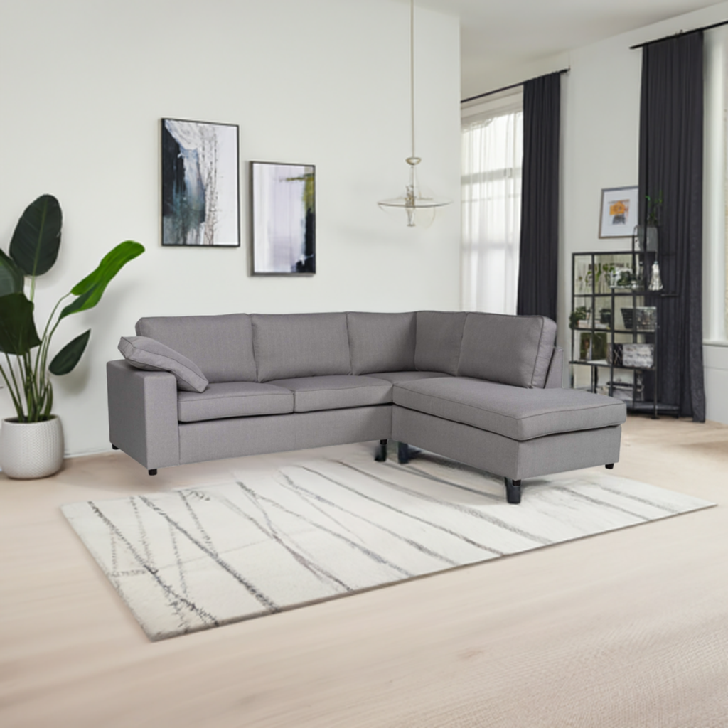 Elevate your living room with the Alton Corner Sofa in Silver Fabric. This modern sofa offers ample seating and a stylish design, perfect for entertaining guests or relaxing. Crafted with durable materials for long-lasting enjoyment. Free Shipping Available!