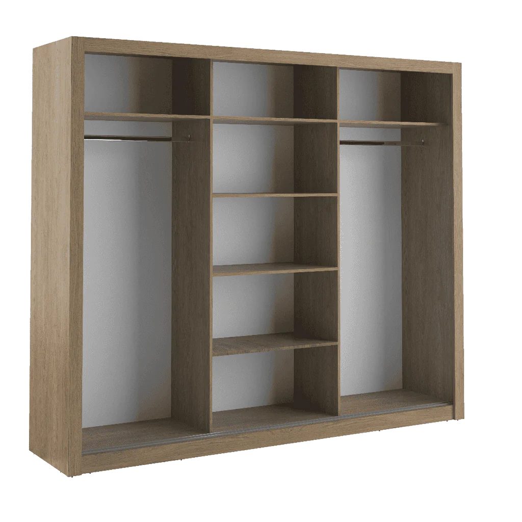 The AR-02 is a brilliantly designed wardrobe with three mirrored doors and aesthetic craftsmanship. It stands apart with its large, functional structure and offers storage space in the form of seven compartments and two exclusive hanging spaces.