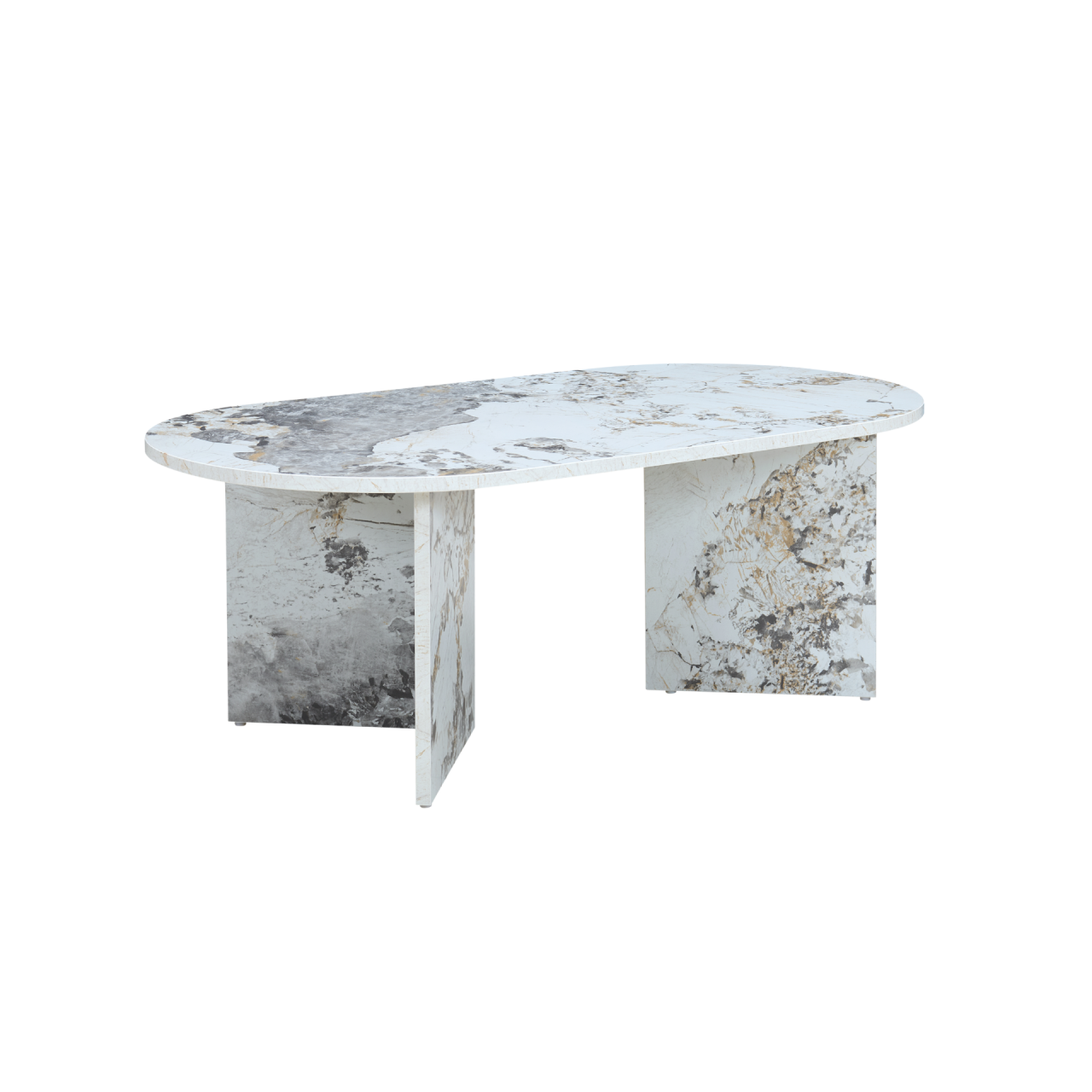 The Aura Oval Coffee Table is a bold, sculptural piece designed to elevate modern living spaces. Its long oval tabletop features a smooth marble‑effect finish in Pandora, showcasing subtle veining and natural stone texture. The surface is scratch‑resistant and heat‑resistant, making it ideal for everyday use.