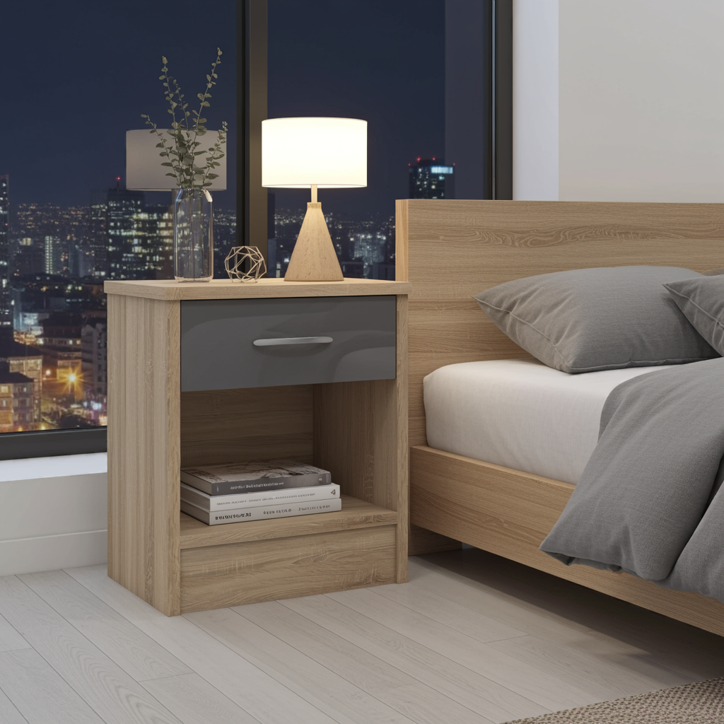 Elevate your bedroom with the Bardalona Bedside Table – Grey Gloss. This compact bedside cabinet blends contemporary design with practical storage. Its high-gloss grey finish adds a touch of sophistication while maintaining a neutral tone that complements a wide range of interior styles.