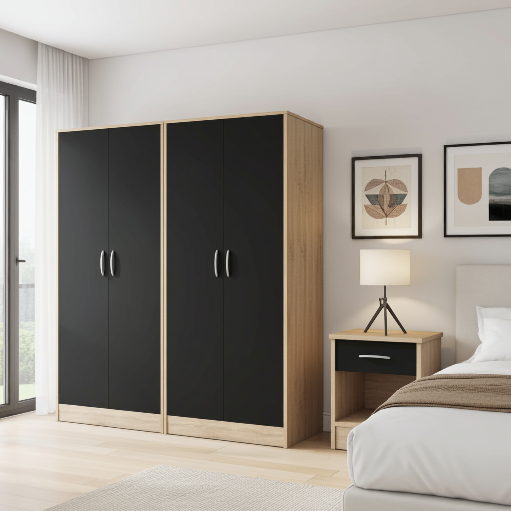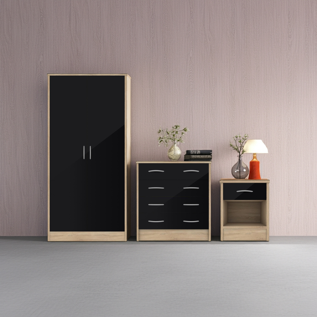 The Bardalona Trio Set – Black Gloss is a smart, coordinated solution for modern bedrooms. Featuring a 2-door wardrobe, a 4-drawer chest, and a compact bedside table, this set offers versatile storage in a bold, high-gloss finish. The wardrobe includes full hanging space with a shelf, while the chest and bedside provide ample drawer storage for clothing and essentials. Designed for style and practicality, each piece is crafted from durable laminated board and requires assembly.