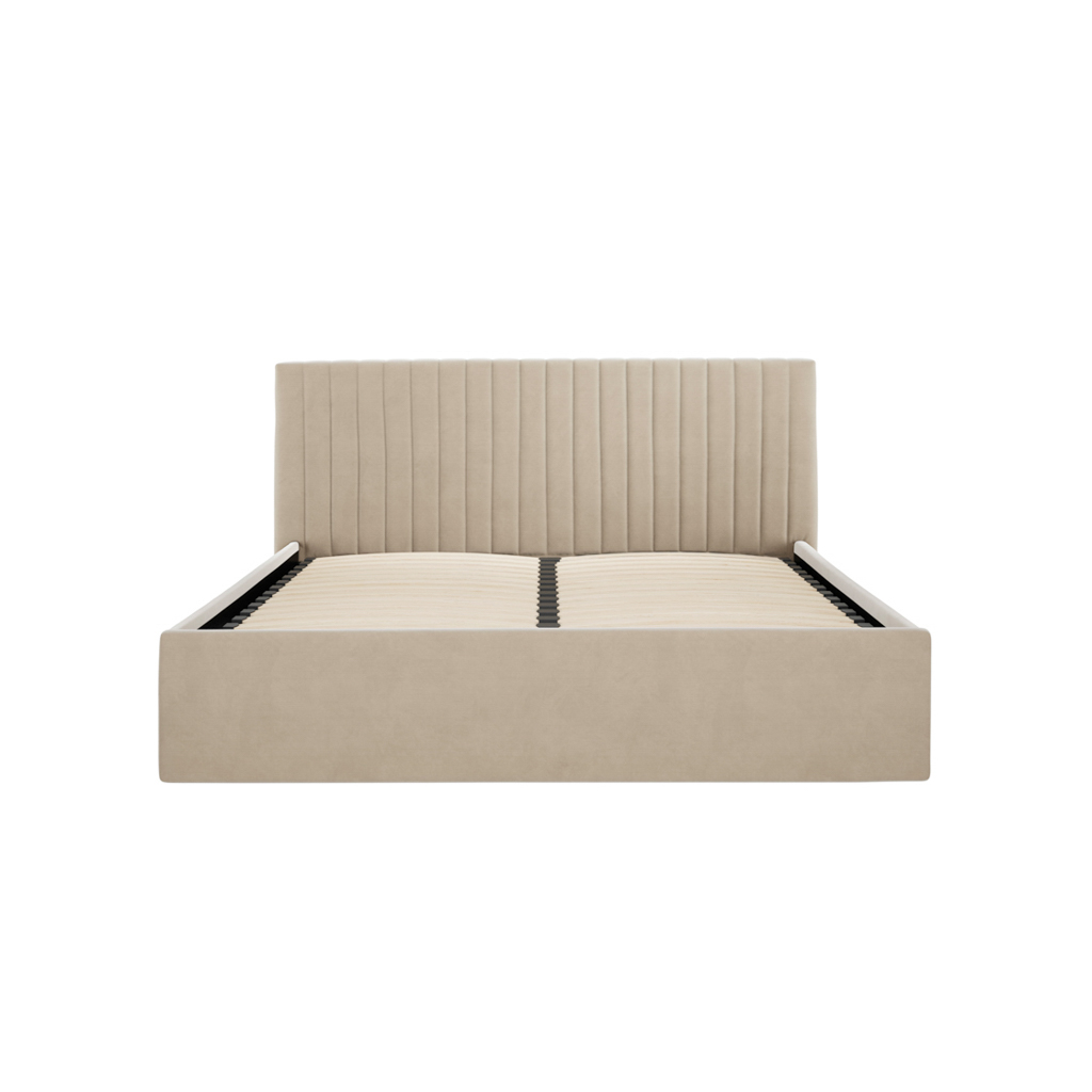 The bed features a beautifully upholstered fluted vertical‑line headboard, adding subtle texture and sophistication. Its warm beige velvet finish blends effortlessly with neutral, minimalist and modern interiors. Available in two headboard heights, it allows you to tailor the look to your bedroom style.