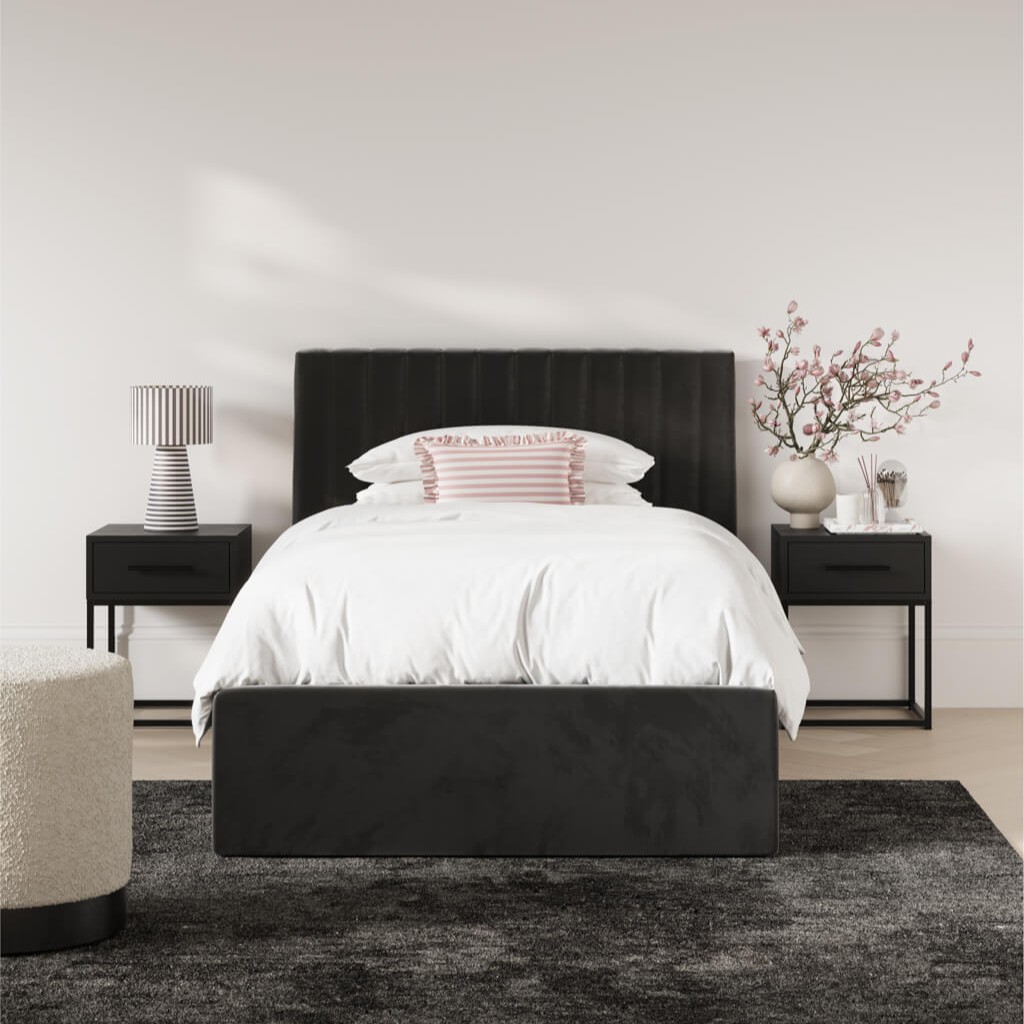 The Berlin bed features a minimalist low‑profile frame upholstered in smooth black fabric, making it easy to style with any décor. It's simple, modern silhouette suits contemporary, industrial and monochrome bedroom themes. The stitched headboard adds subtle texture without overpowering the design.