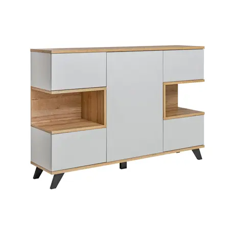 The Bogota sideboard stands out with its unusual but highly functional structure. It has a 16mm laminated board carcass with a push-to-open system mechanism replacing the traditional handles system. The cabinet is very space-saving with a pair of open compartments at the sides for decorations, multiple one-compartment hinged doors and a large shelving space at the center.