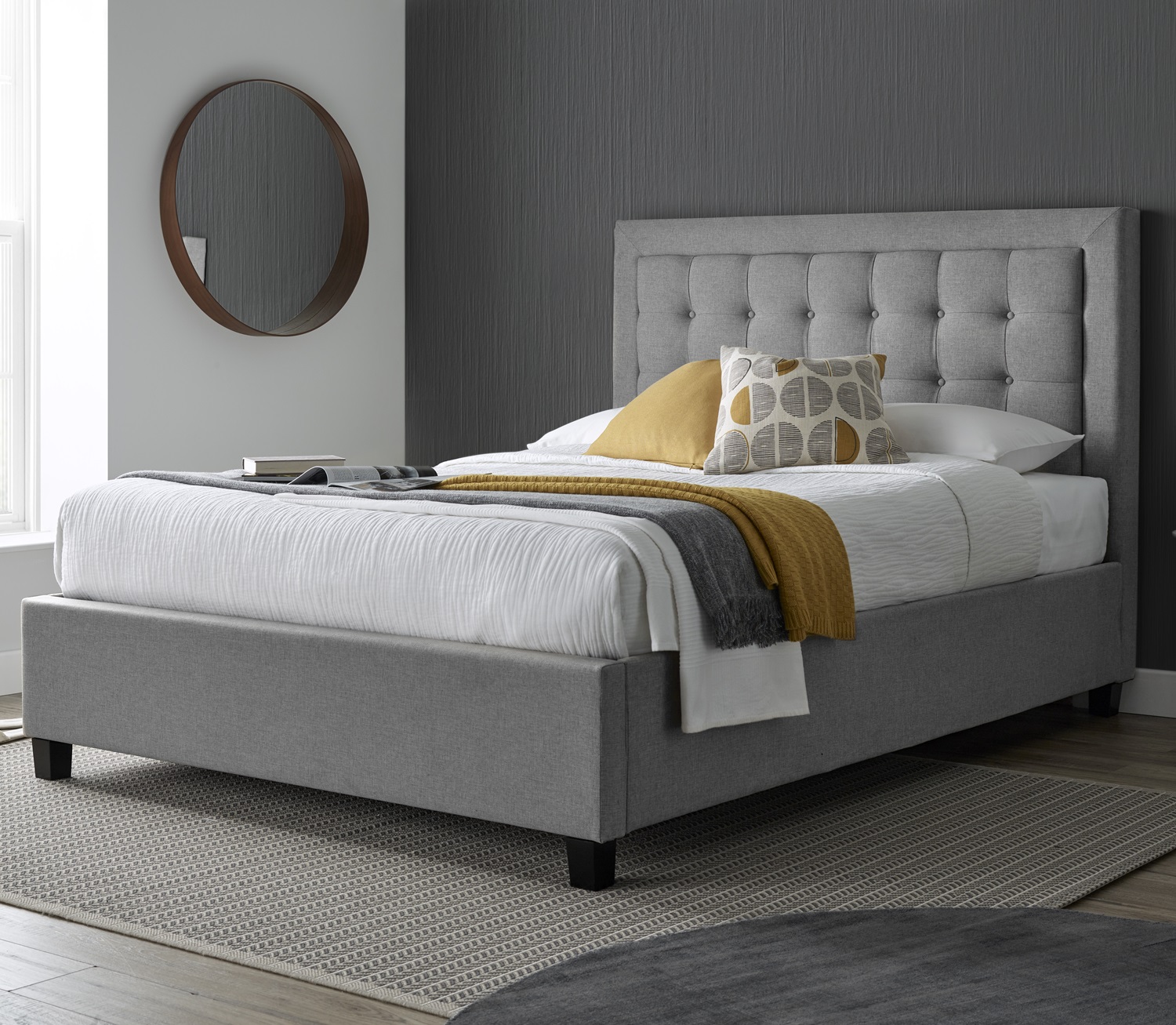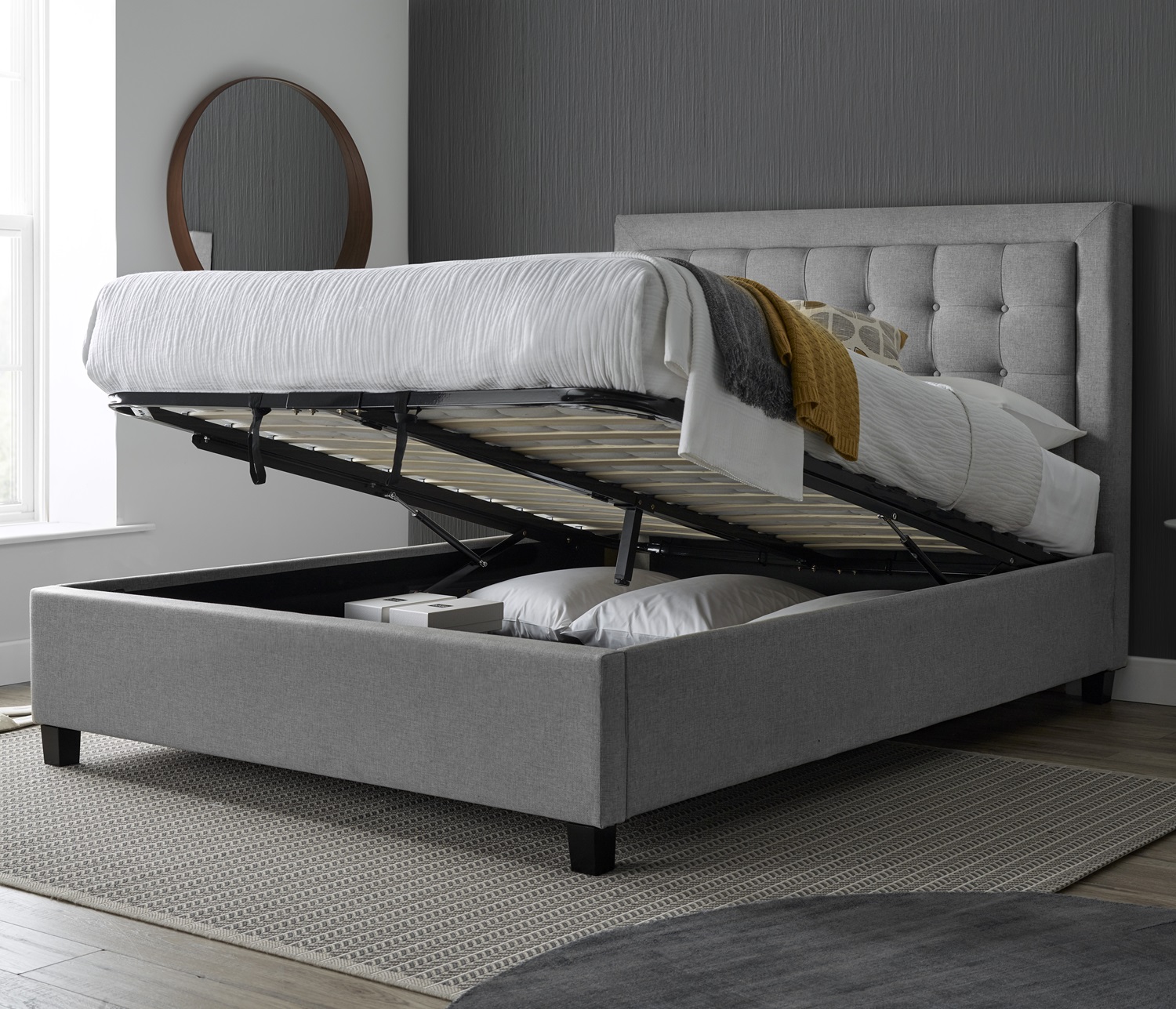 Brandon Grey Fabric Ottoman Bed – Double | Gas Lift Storage Frame with Buttoned Headboard