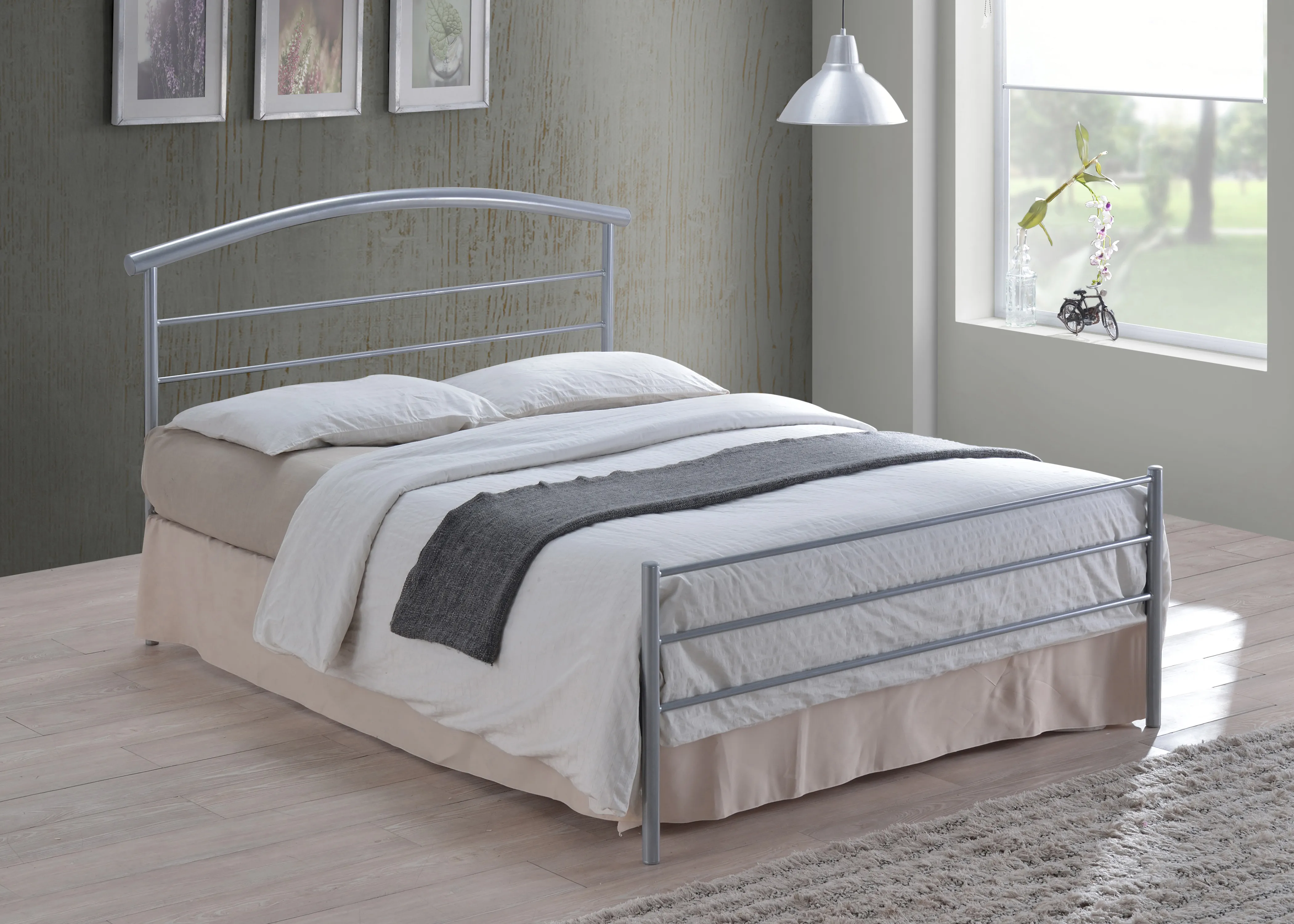 Silver metal bed frame with an elegantly curved headboard and a low footend. Sprung slatted base.