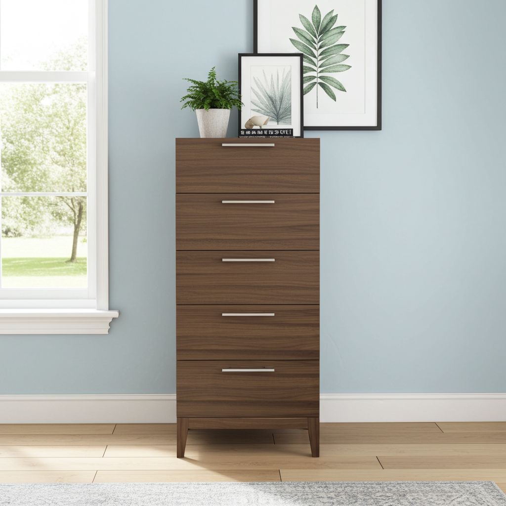The Calla Narrow Chest is a beautifully designed vertical storage solution ideal for bedrooms where space is limited. With its slim profile and premium walnut finish, this five‑drawer chest combines modern elegance with everyday practicality. Its compact footprint makes it perfect for small bedrooms, dressing areas or as an additional storage piece alongside wardrobes and bedside tables.