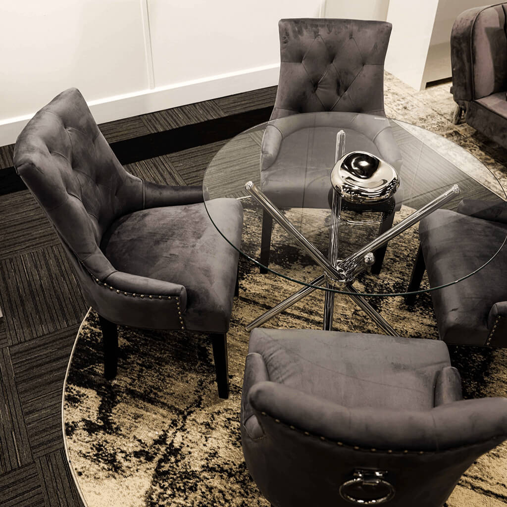 The Casa Glass & Silver Dining Table brings a playful, modern twist to your dining space. Designed with a clear circular glass top resting on intricately mingled chrome legs, this table instantly becomes a talking point in any kitchen or dining room. The centre‑belted chrome frame adds sculptural interest while keeping the design light, airy, and easy to style.