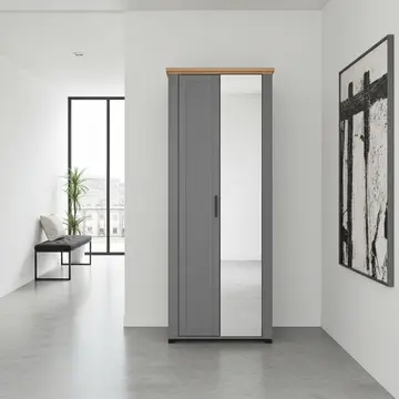 A slim mirrored wardrobe in graphite grey and artisan oak effect—perfect for stylish, space-efficient bedroom storage.