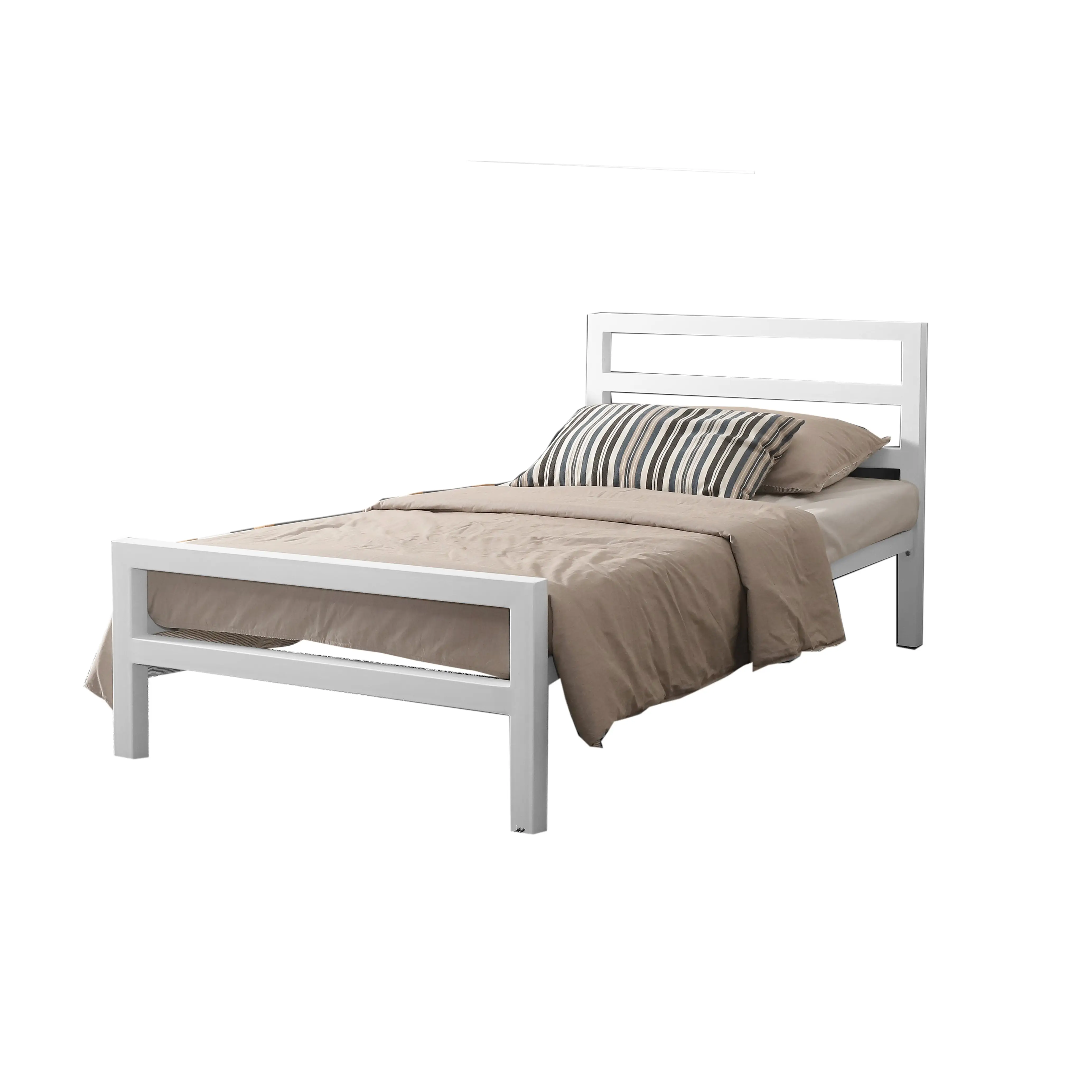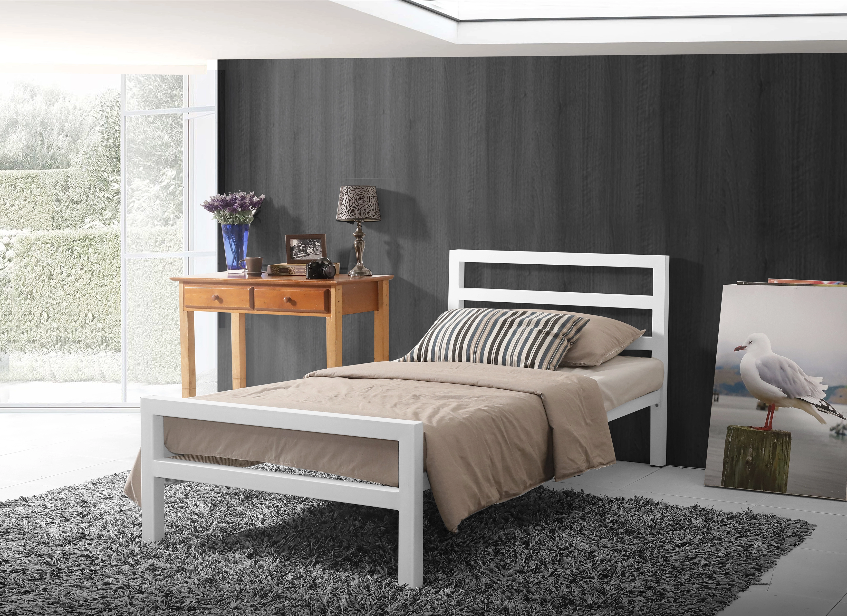 Modern bed frame with straight edges finished in white, Sprung slatted base.