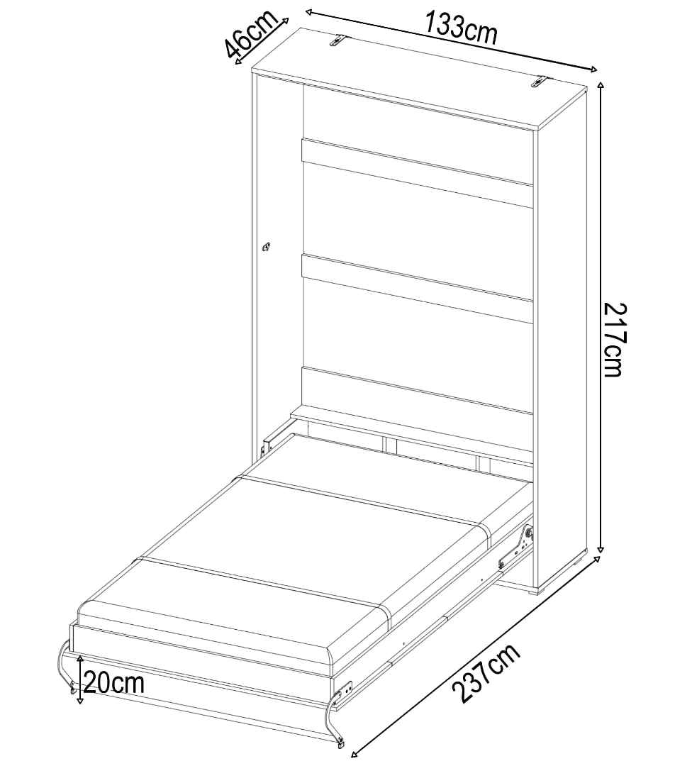 The CP-02 vertical wall bed comes with enough space to accommodate a double-size mattress. It is available in three different universal colours including a matt and gloss version of white or the sophisticated grey matt, allowing the user to effortlessly blend the bed in any interior style. For safety, self-holding feature along with a locking system has been implemented. Duvet straps are included.