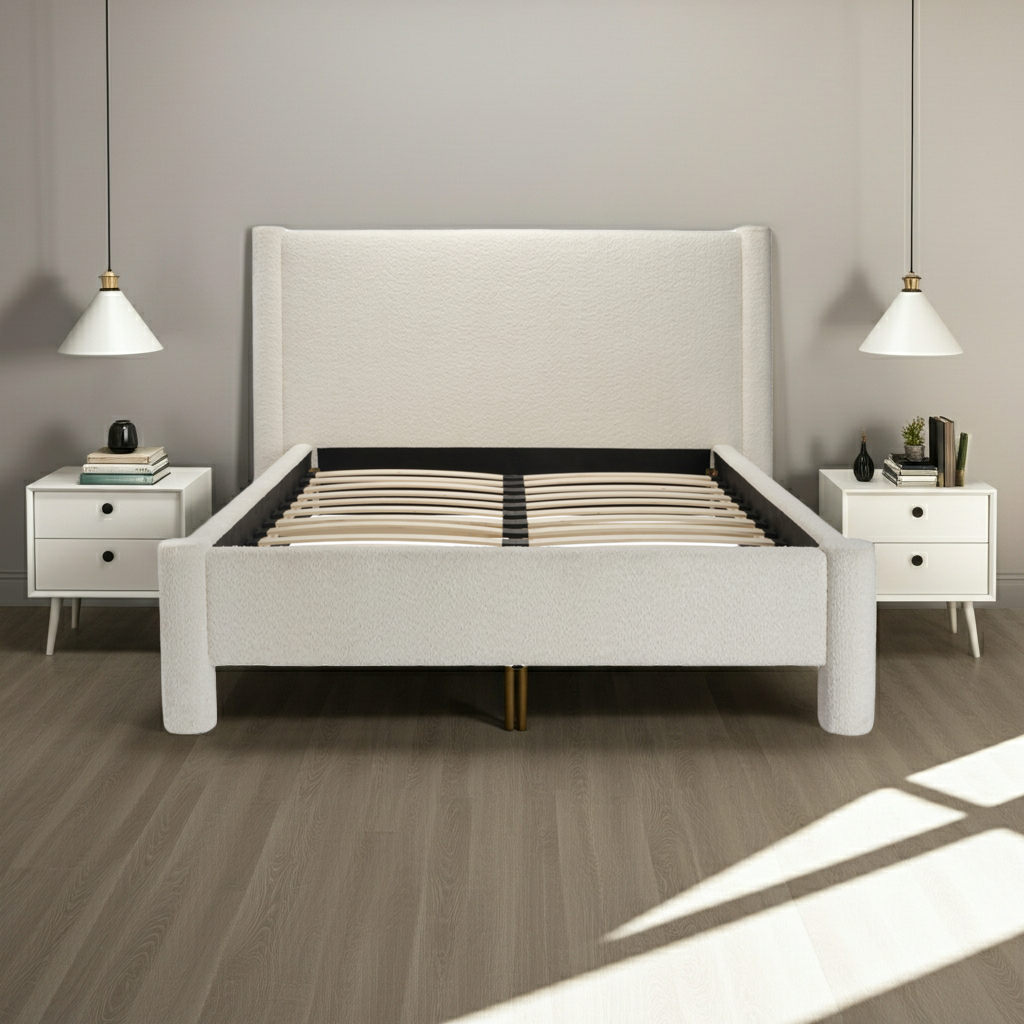 The Dena Snow Bed is a stylish, fully upholstered bed frame designed to bring soft texture and modern comfort to contemporary bedrooms. Wrapped in snow‑coloured textured bouclé, the bed offers a warm, tactile finish that instantly elevates the space. Its neutral tone blends effortlessly with a wide range of interior styles, from minimalist and Scandinavian to modern and boutique‑inspired rooms.