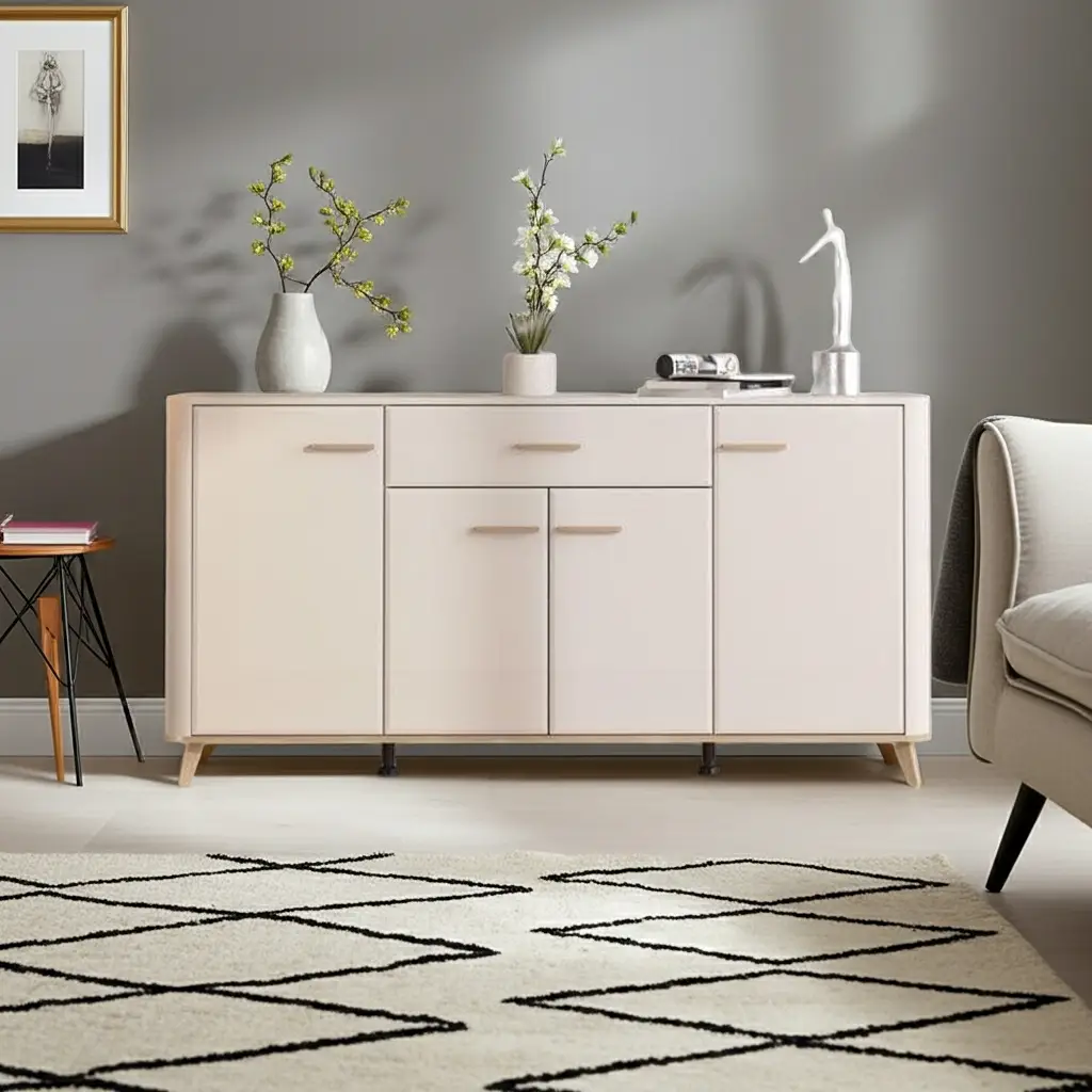 Its wide profile (H90.5 × W180 × D40 cm) makes it ideal for open‑plan rooms or dining areas. Behind the four doors and spacious drawer, you’ll find generous hidden storage — perfect for tableware, linens, or everyday essentials. Rounded edges and tall legs create a light, airy silhouette that elevates modern interiors.