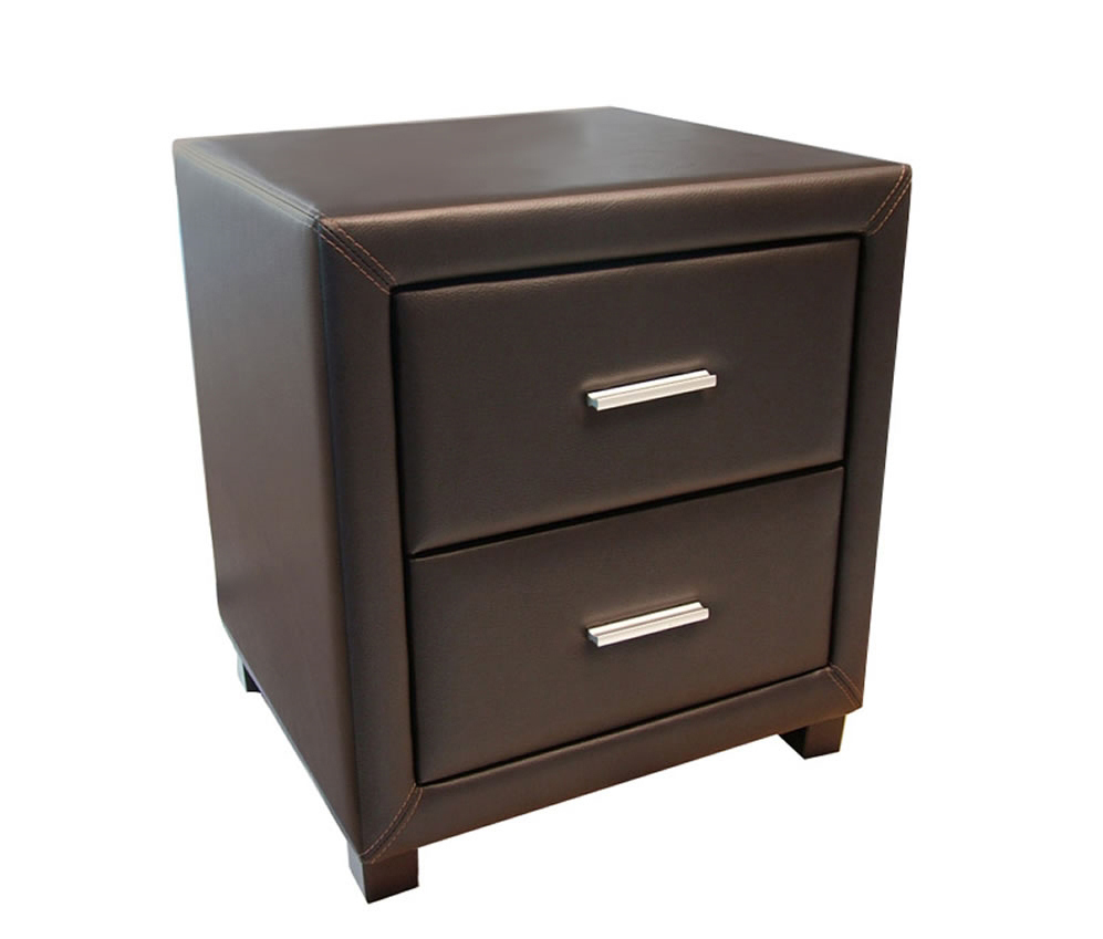 Stylish two drawer bedside cabinet finished in faux leather, with solid lines and neat stitching details.