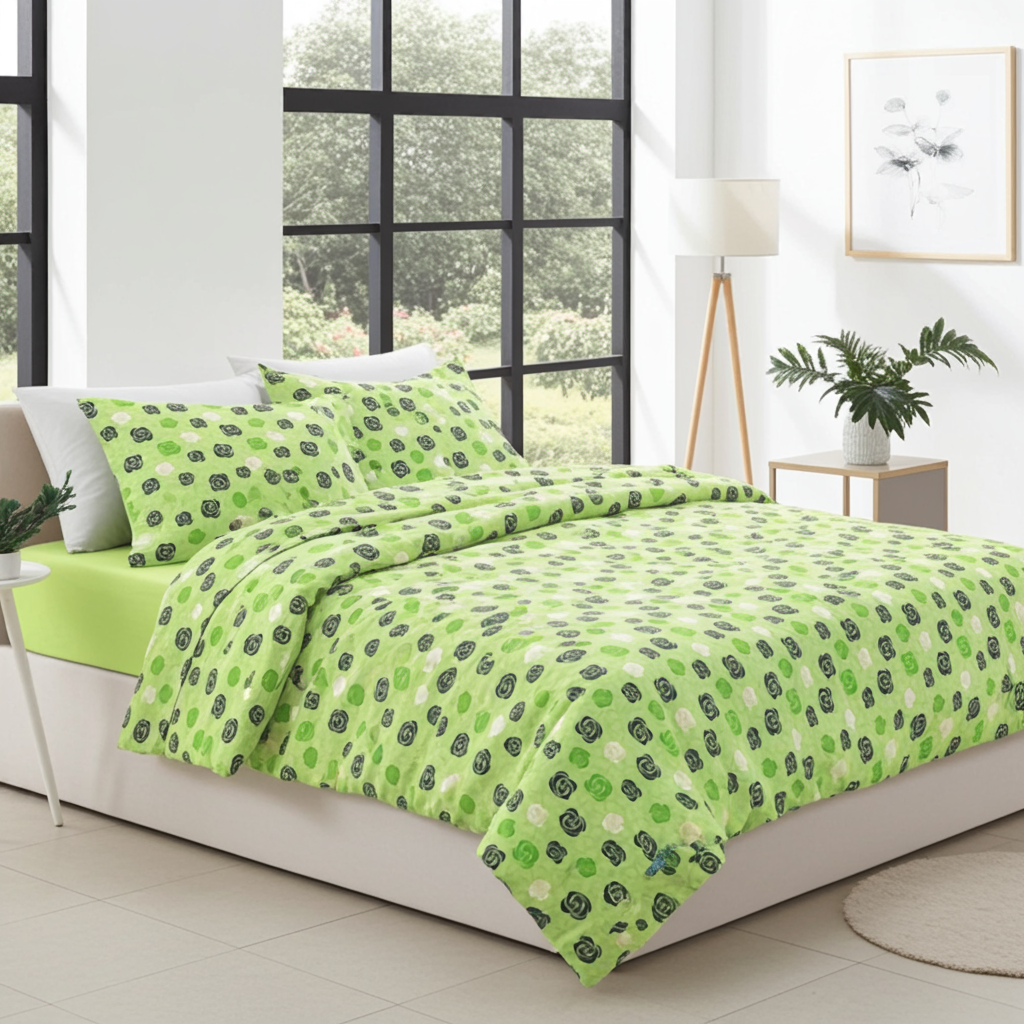 The Double Size Cotton Duvet Cover Set with Button Fastening & Fitted Sheet offers a fresh, modern look with everyday practicality. Crafted from 100% pure cotton (146 g/m²), this set is breathable, durable, and free from synthetics. The green tone adds a calming touch to your bedroom, while the button fastening ensures easy handling. Included are two housewife pillowcases and a fitted sheet (same pattern as duvet cover), making it a complete bedding solution for double beds.