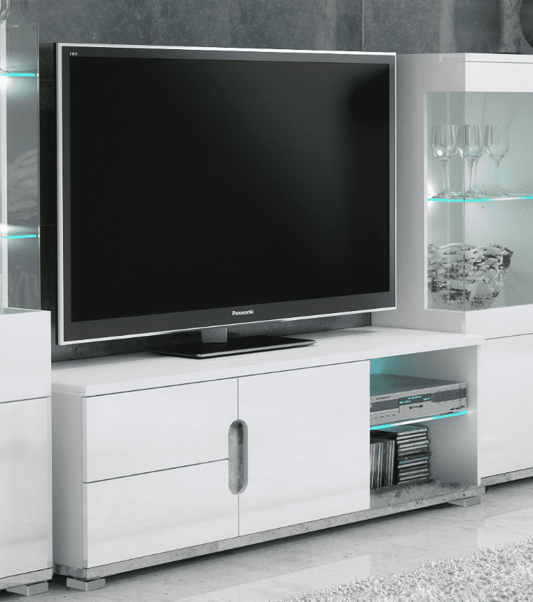 Dunbar White gloss and concrete grey TV Display Units with Lights add class and style to your living room. This TV display cabinet comes with lighting and concrete grey detailing that looks incredible. The LED lights are low profile and glow gently through the glass shelf on this entertainment unit. Spacious, sleek and flaunts a modern design with an organised look throughout.