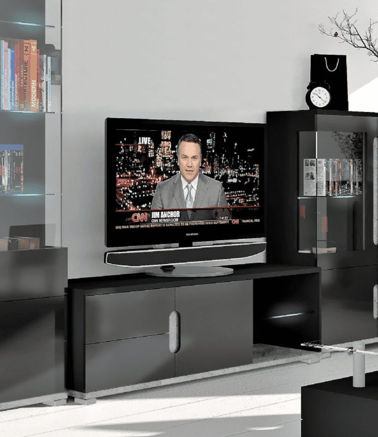 Dunbar black gloss and concrete grey TV Unit with Lights. Featuring 1 door, 2 drawers and 1 shelf.