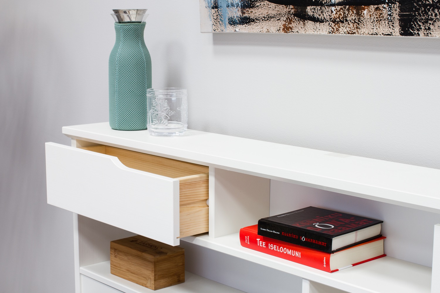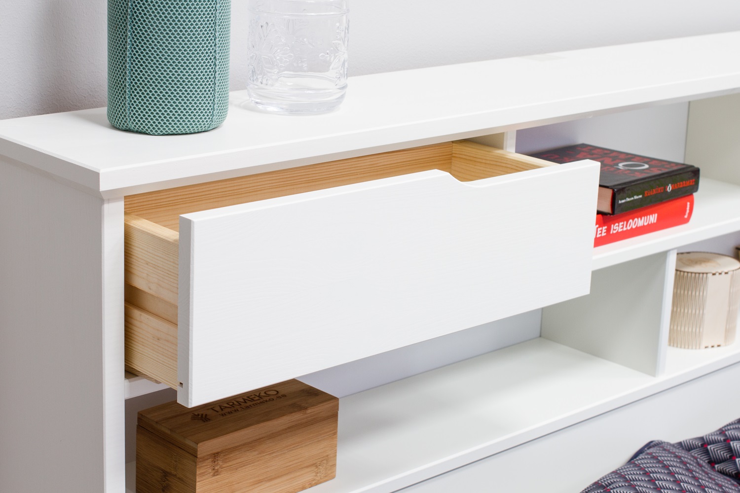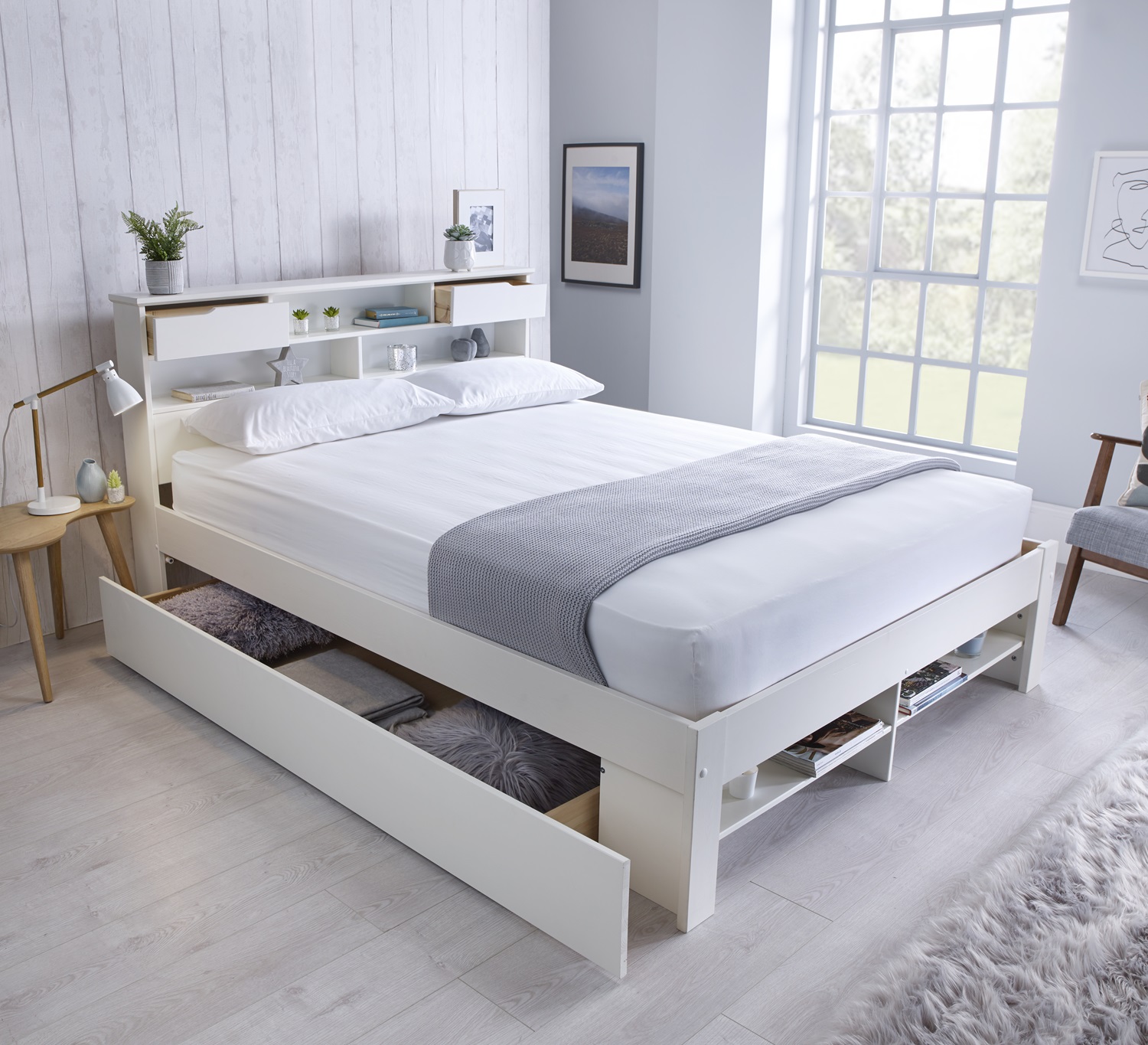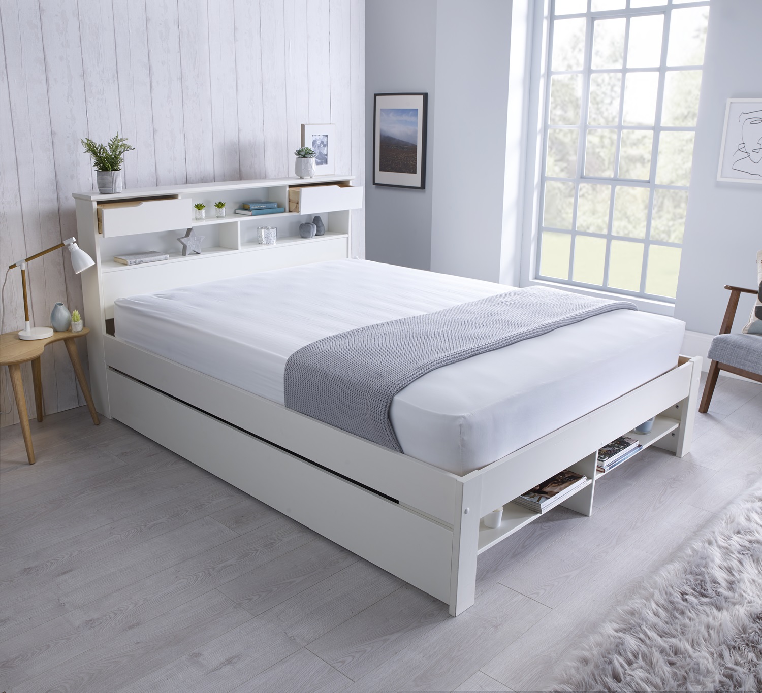 Bring timeless charm and smart storage to your bedroom with the Fabio White Wooden Bed. This solid pine bed frame is finished in a classic white and designed with subtle contemporary styling. The headboard includes two built-in drawers, perfect for storing books, blankets, or nighttime essentials. The foot end also offers additional shelving, and the under-bed clearance allows for optional Fabio Drawers (sold separately) to be added on either side.