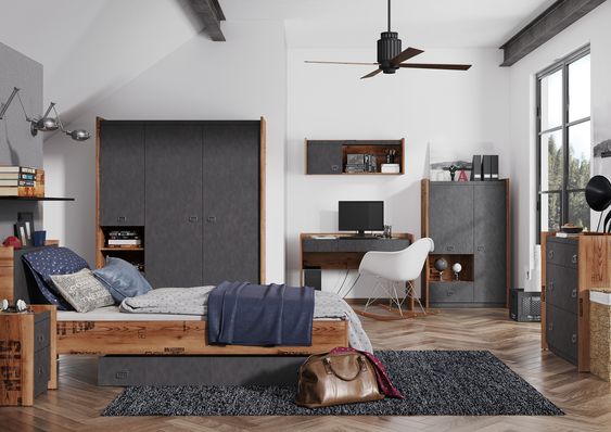The Fargo three-door wardrobe dares to be different. Made from solid laminated board, it is finished in a vintage Alpine Spruce d?cor with fronts that imitate raw concrete : a contemporary industrial look. Storage space is tremendous, and offered in the form of two drawers, two open compartments and five closed compartments. Its single hanging rail is generously sized and perfect for all your professional and casual clothing.