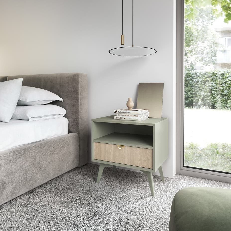 Experience functionality and style with the Forest Bedside Table. Its spacious drawer and open compartment offer ample storage space for your essentials, while the gold aluminium handles add a touch of elegance to the piece. Crafted from durable 16mm laminated board, this table guarantees long-lasting use. The wooden legs provide stability and complement its overall aesthetic, making it a versatile addition to any bedroom.