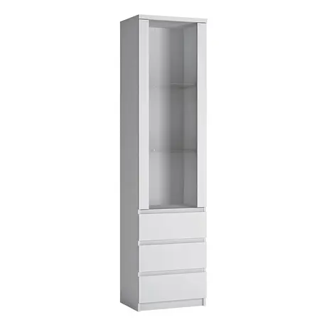 A glazed display case with a simple shape with lots of practical solutions is a proposal from the Fribo collection. The site has three spacious drawers with the possibility of full extension, and the handle-free system used in them will allow for comfortable use of the furniture. The body is universal , which means that it is extremely practical , it can be installed so that it opens to the left or right - the choice is yours. The interior of the site can be beautifully illuminated with energy-saving LED lighting (sold separately), placed behind glass shelves or under the top crown, it is a perfect base for decorations and creates an atmospheric atmosphere. The front has toughened safety glass. The simple, minimalist form of the furniture will work in modern interiors, and the alpine white decor will allow for countless color combinations in the interior of the room. The furniture is made of laminated chipboard, resistant to moisture, scratches, damage and high temperature. The program is available in two color versions: Alpine White and Golden Ribbeck Oak.