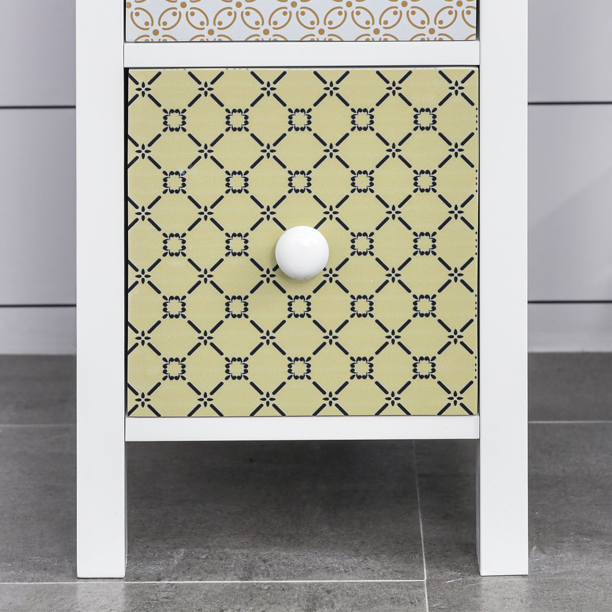 - Geometric pattern prints on each drawer for a splash of striking colour