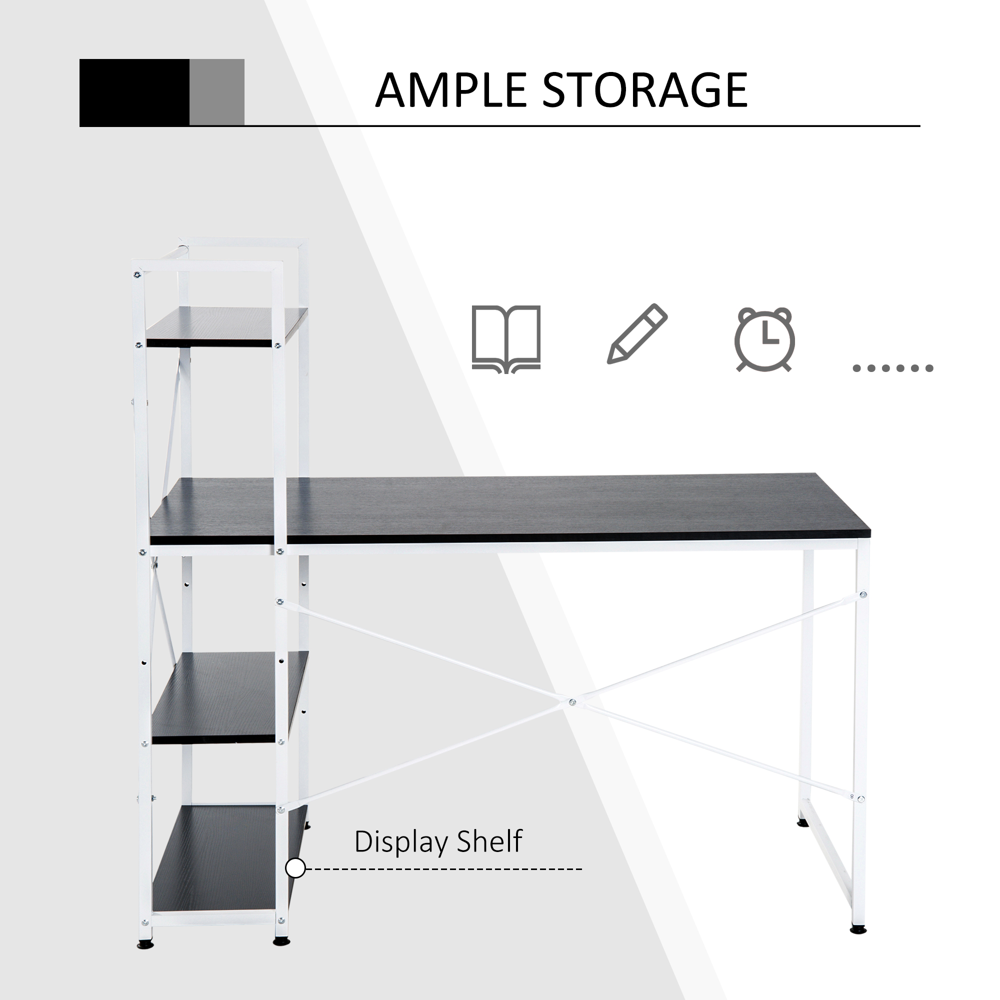 The modern stylish study table from HOMCOM is designed with space saving and multifunction in mind. It comes with a 4-tier bookshelf which can be assembled on left or right side as required. The large open area underneath enables you to comfortably stretch your legs after long working hours. With elegant and functional design, this desk with shelves is an ideal addition to your study or living room and can be used for either home or office.