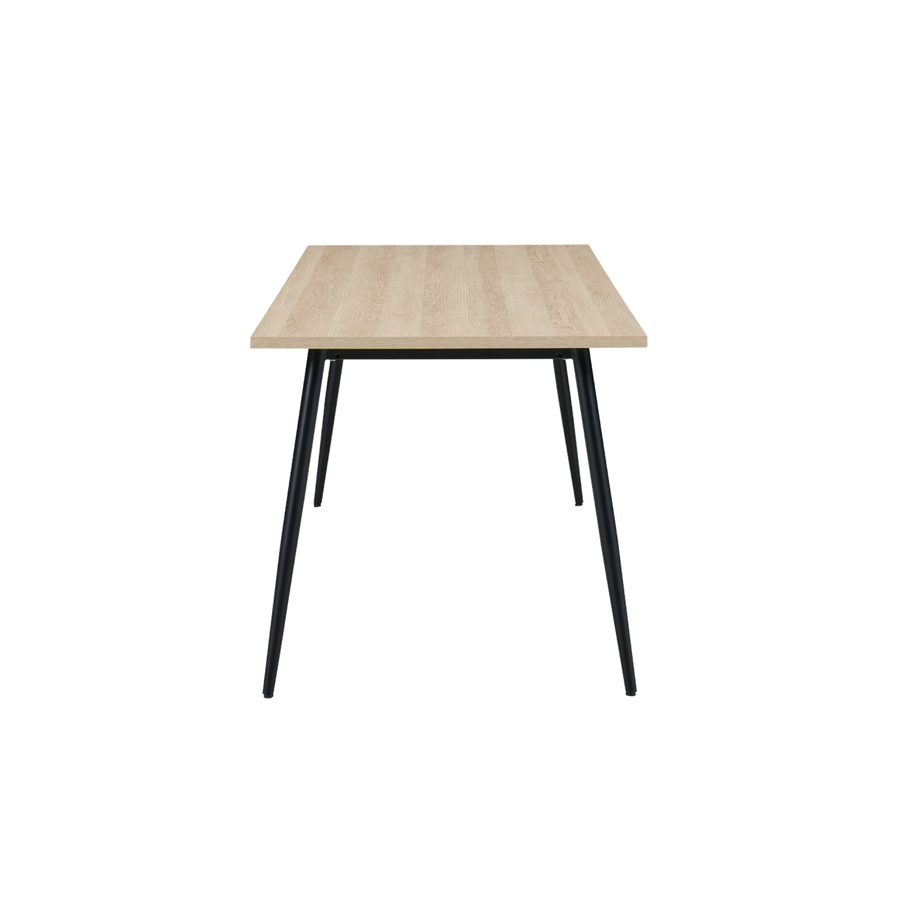 Supporting the table are rounded, matt black powder‑coated metal legs that taper outward for added stability. The combination of the wood‑effect top and sleek metal frame creates a balanced, modern silhouette that suits a wide range of interior styles—from minimalist to industrial to Scandinavian.