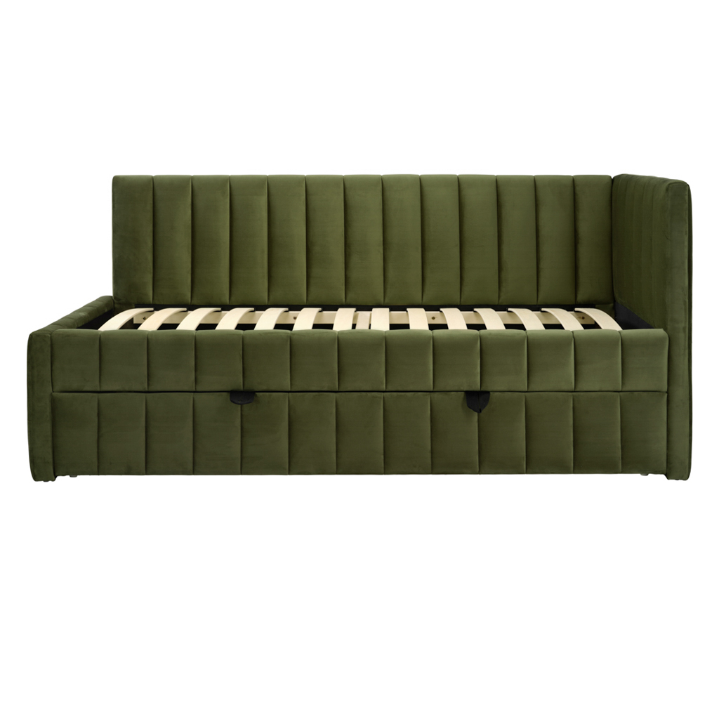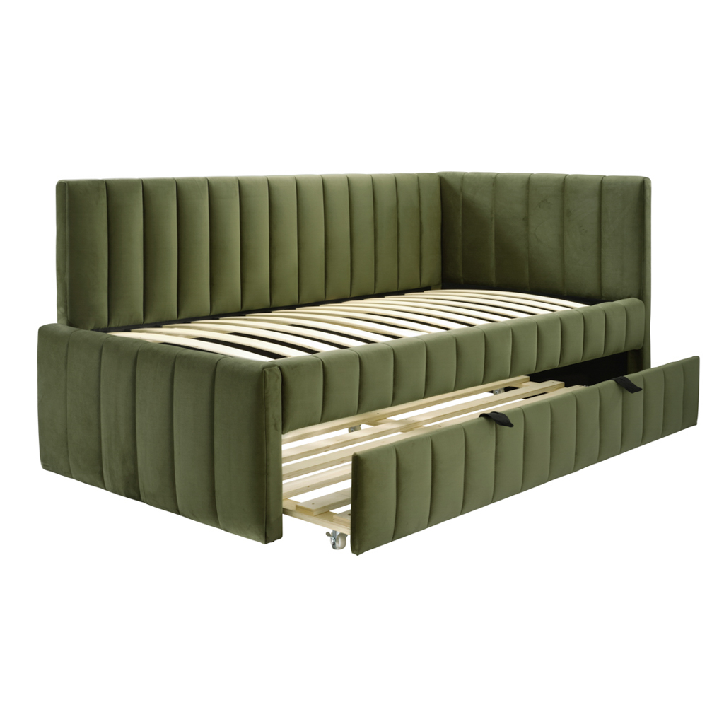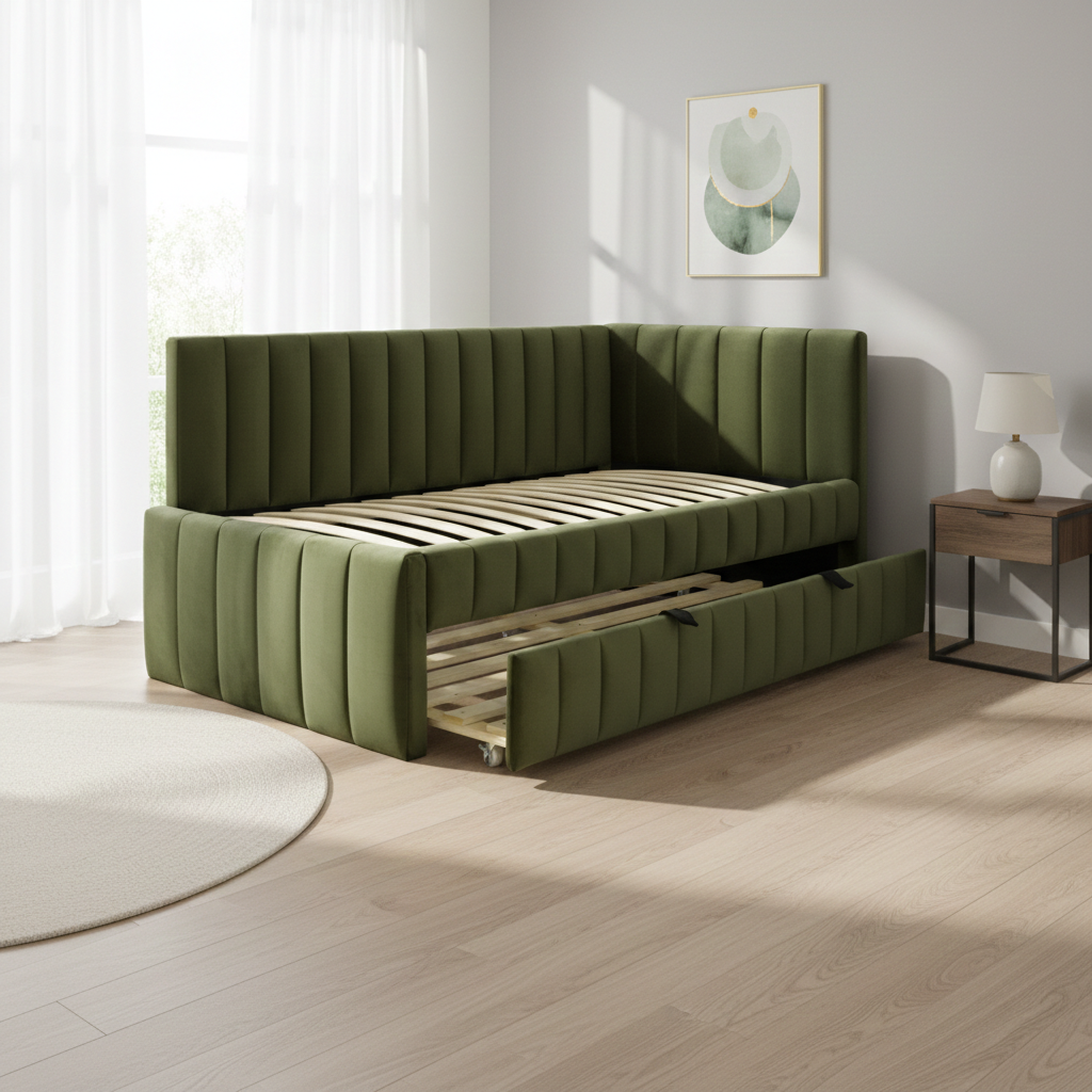 The Ida Moss Day Bed is a luxurious and versatile piece designed to elevate modern bedrooms, guest rooms and multifunctional living spaces. Upholstered in plush moss velvet, the bed offers a rich, tactile finish that adds depth and warmth to any interior. The striking statement colour makes it a standout feature, ideal for contemporary homes that embrace bold yet elegant design.