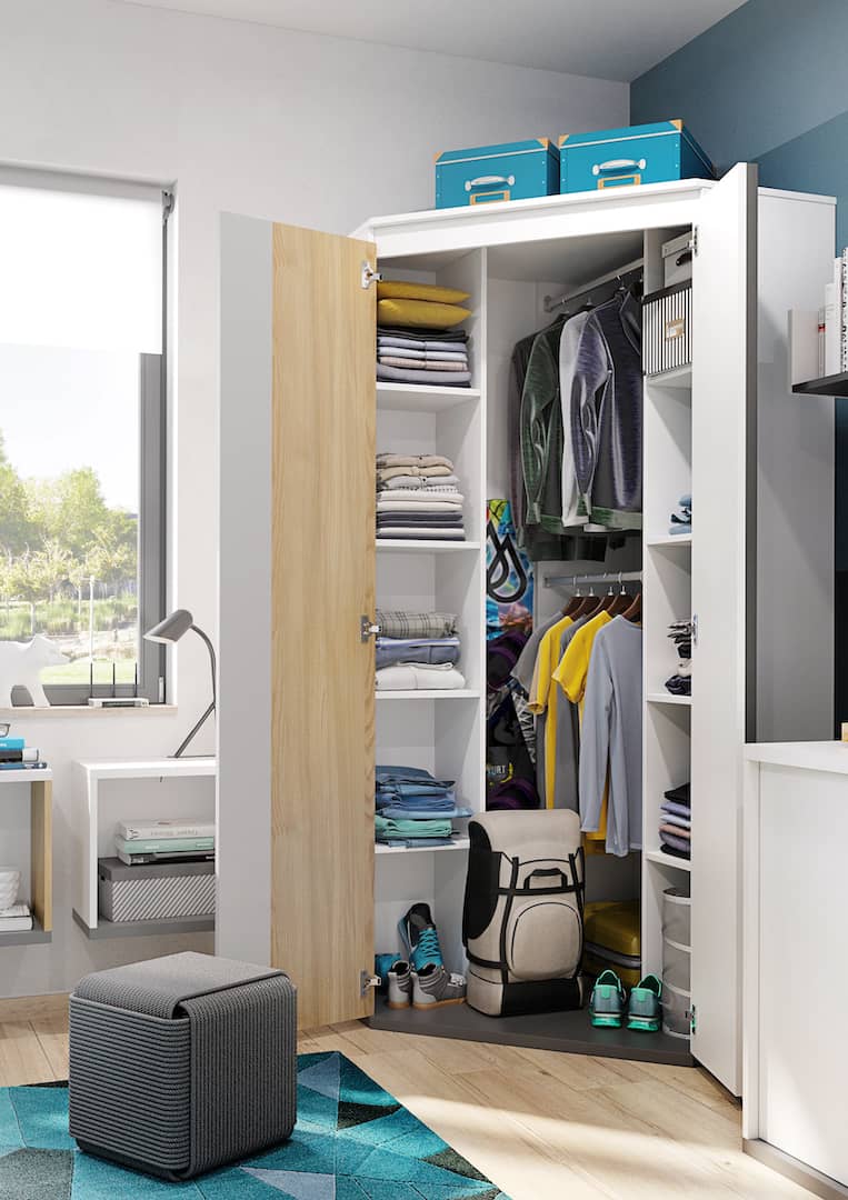 The IM-01 is a stylish wardrobe cabinet with multiple storage options for storing clothes as well as personal belongings. Using high quality materials, this corner cabinet is finished in contemporary colours, ensuring it looks great in any room.