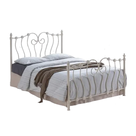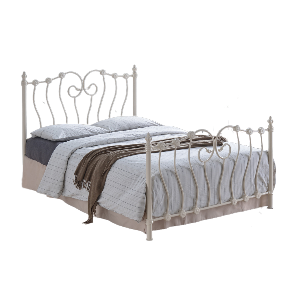 Victorian style metal bed frame is finished in ivory with decorative finials. Sprung slatted base.