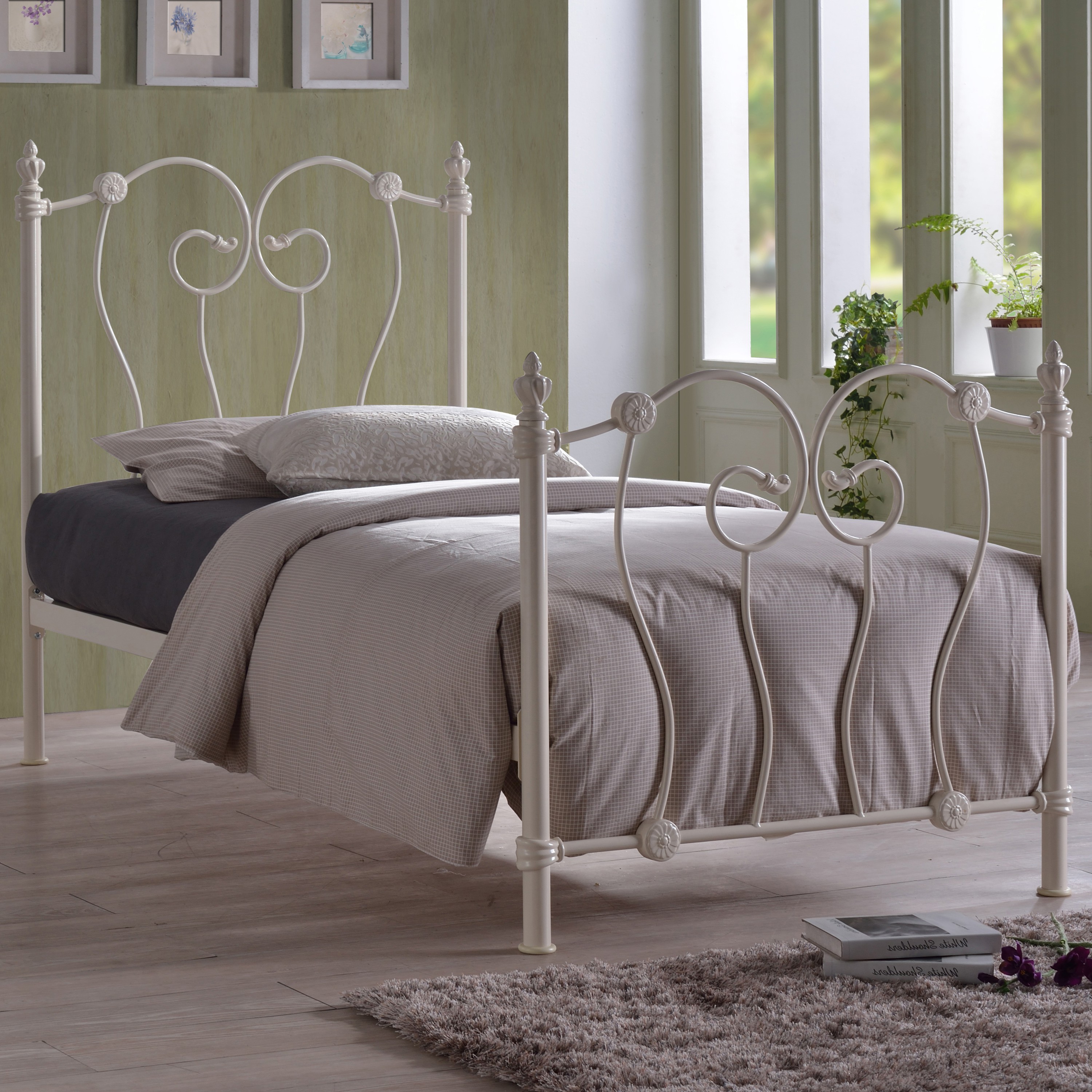 Victorian style metal bed frame is finished in ivory with decorative finials. Sprung slatted base.