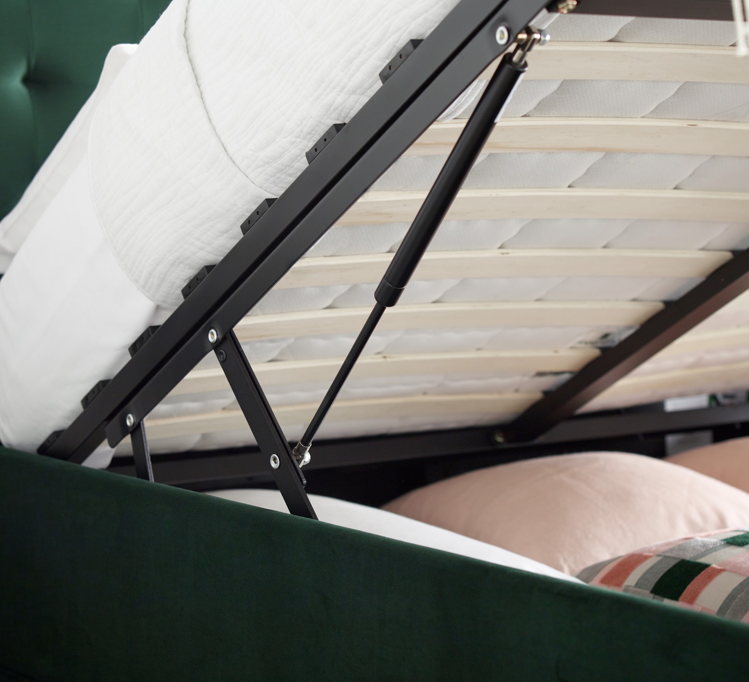 Kingham Green Velvet Ottoman Bed – King | Gas Lift Storage Frame with Deep Tufted Headboard