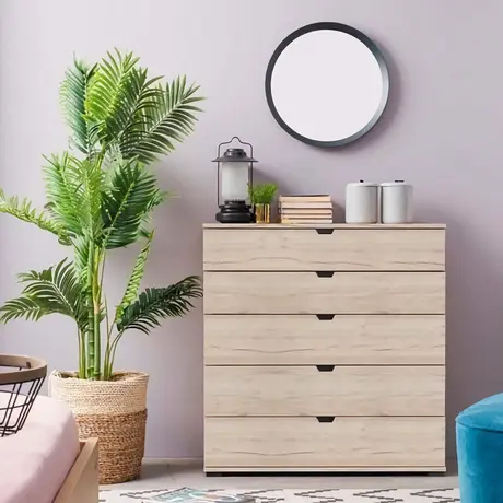 The Kinross Oak Effect Wide 6 Drawer Chest offers a stylish blend of natural oak texture and modern functionality. With six spacious drawers, it provides ample storage for clothes and accessories. It's warm oak finish brings a touch of rustic charm to any bedroom.