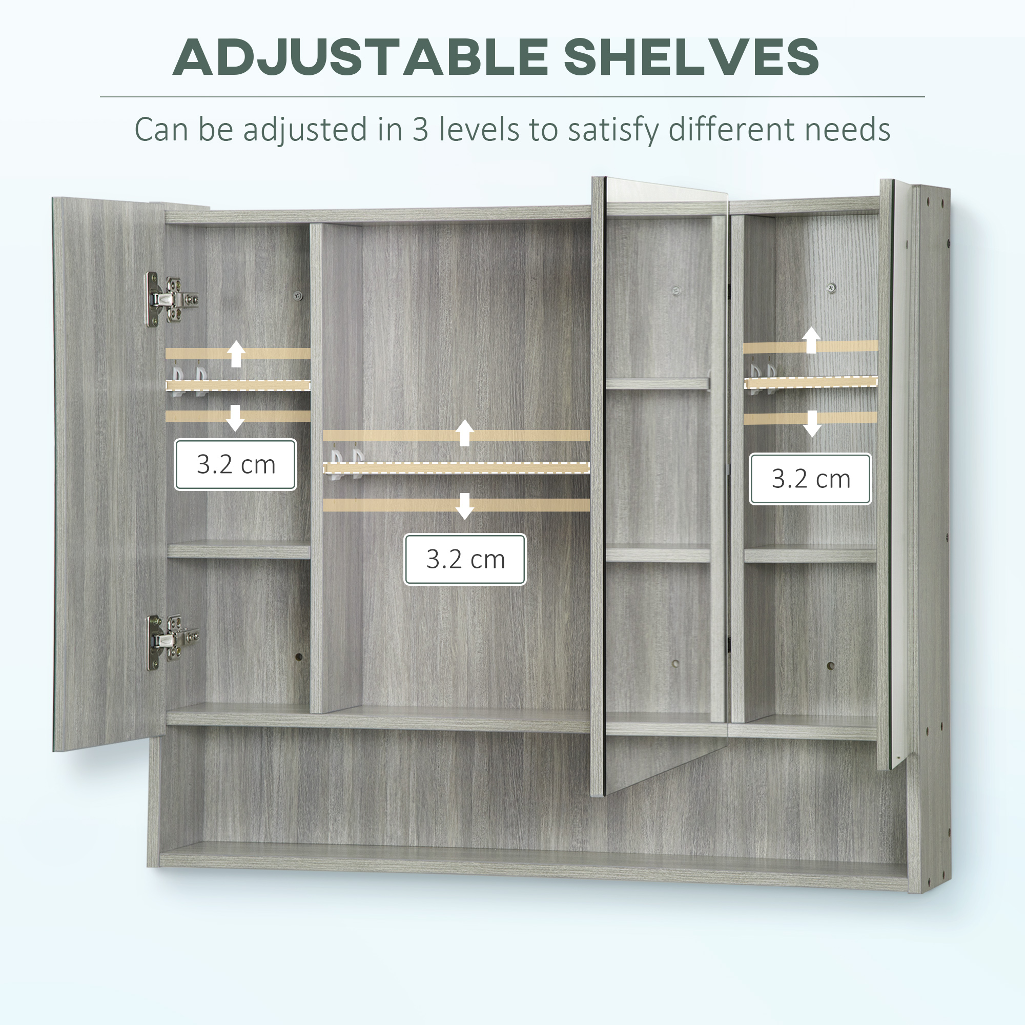 Details about kleankin Bathroom Mirror Cabinet, Wall Mounted Storage Cabinet with Adjustable Shelves, 3 Doors and Cupboards, Grey