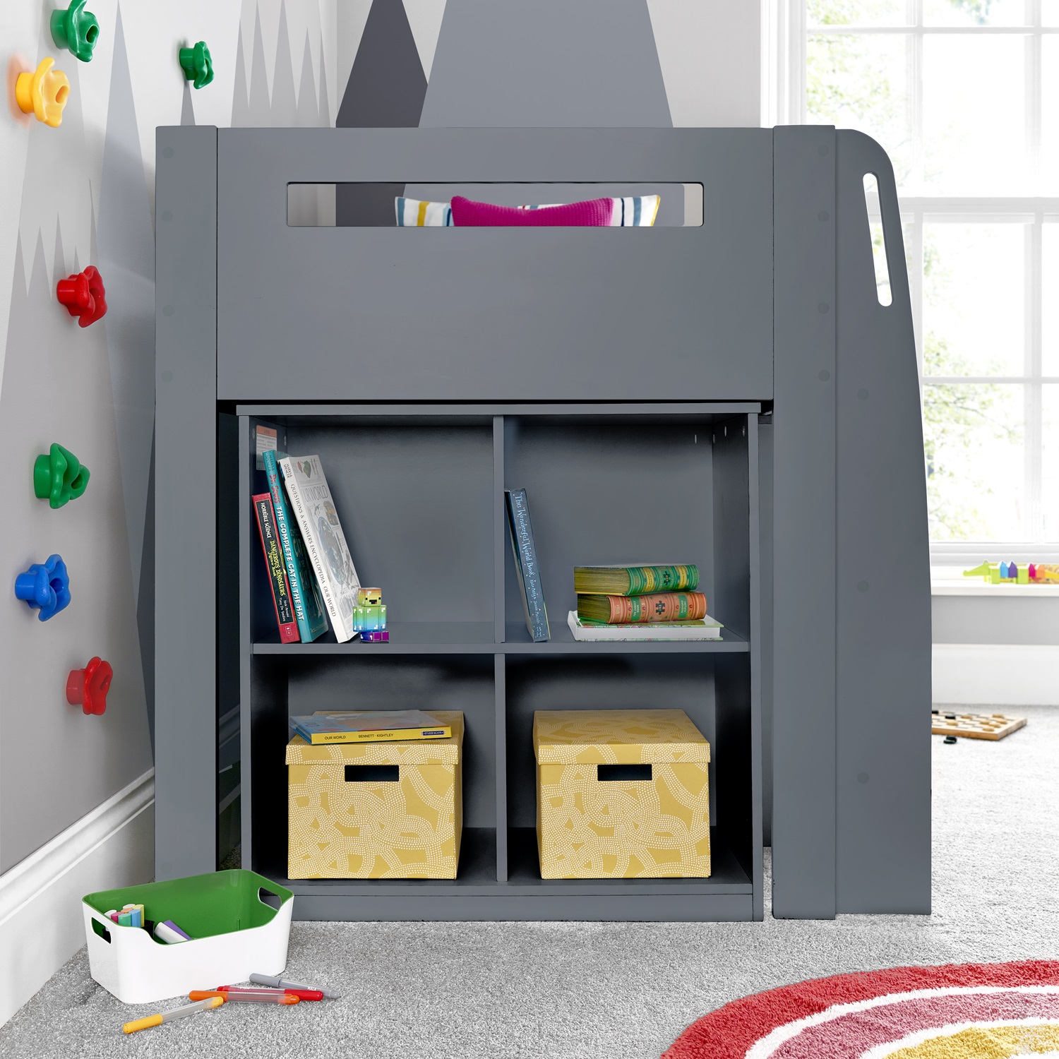 Transform your child’s bedroom with the Lacy Grey Storage Mid Sleeper Bed – Single. This contemporary bed combines vibrant style with clever functionality. Designed for kids and teens, it includes multiple built-in storage units to keep the room tidy and organized. The sturdy ladder with handholds can be assembled on either side, and safety rails ensure secure sleep.