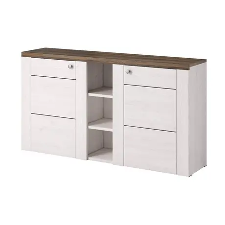 A functional and stylish sideboard cabinet, the Larona 26 features two hinged doors, a pair of covert shelves and three open compartments for storage. Beautifully crafted from 16mm laminated board, this piece of furniture is both practical and impressive. Available in three shades of oak, it will effortlessly blend any modern or vintage decor. Perfect for keeping clutter out of sight and complementing your home with a touch of class.