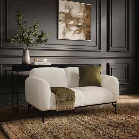 Bring warmth and comfort to your living space with the Larsa Calm Sofa – a modern 2‑seater designed for everyday relaxation. Upholstered in soft Calm Sherpa fabric, this sofa offers a cosy, tactile finish. Its unique matte black metal legs, padded curved arms, and double back cushion design enhance both comfort and style.