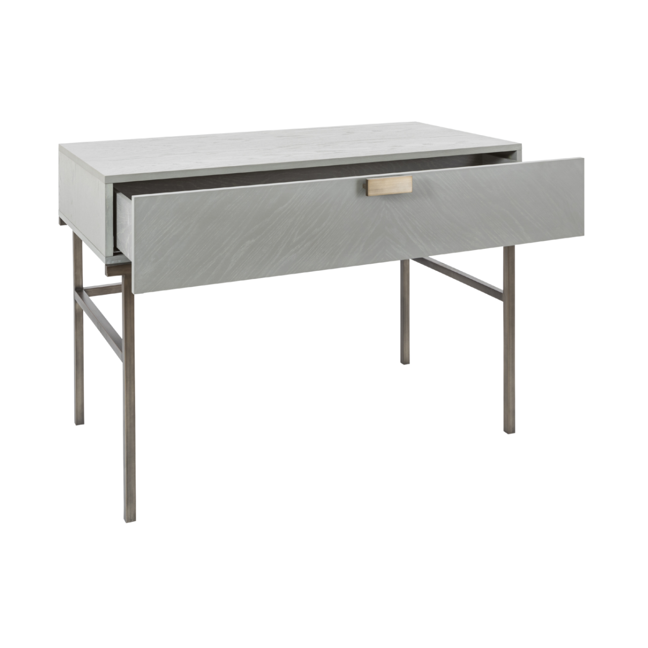 The standout feature of the Lilly table is its chevron‑patterned drawer front, adding texture and sophistication to the design. The bronze metal frame and handles create a warm contrast against the grey oak veneer, giving the piece a boutique‑style look. Its clean lines and contemporary silhouette make it suitable for modern, Scandinavian and luxury interiors.