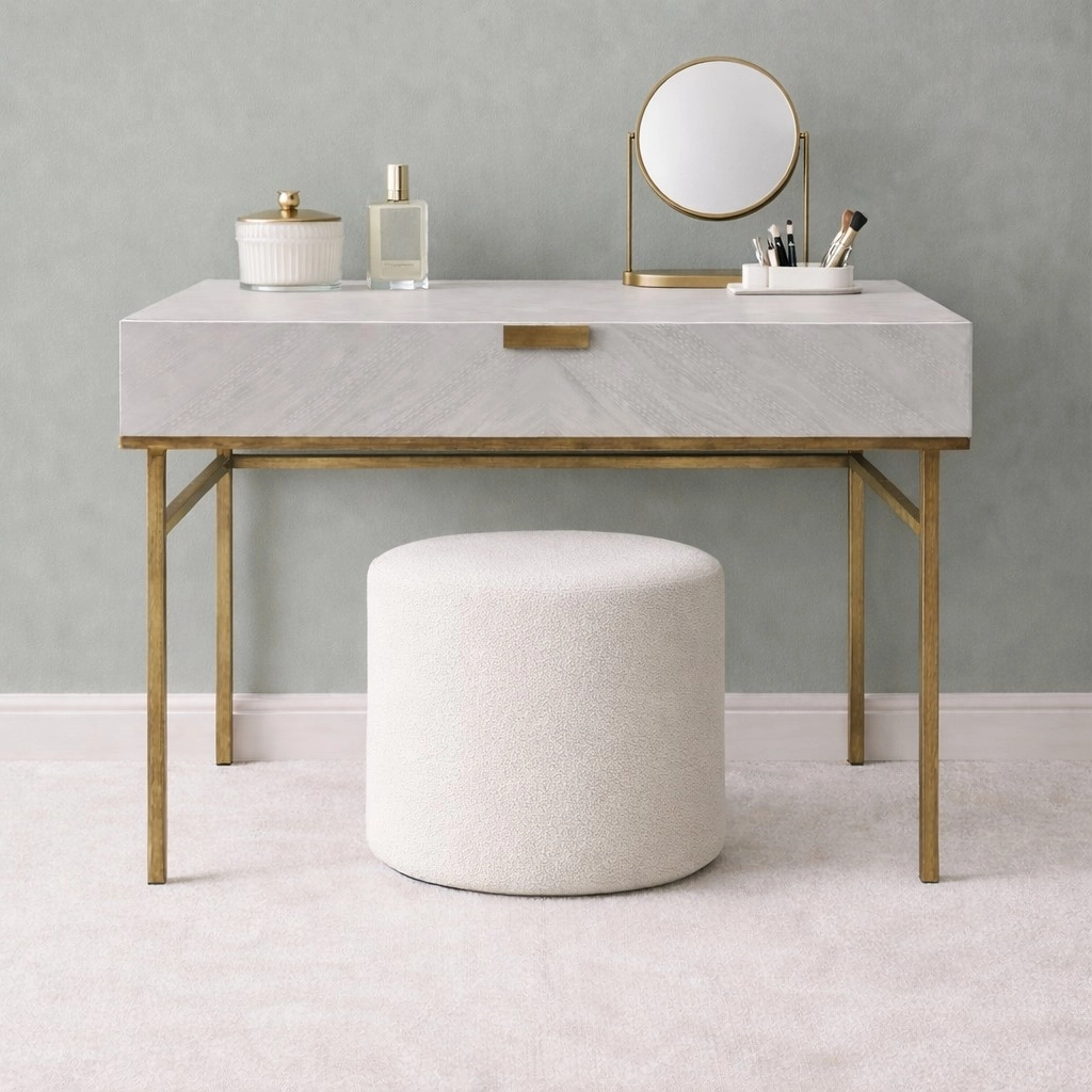 The Lilly Dressing Table is a beautifully designed multifunctional piece that works equally well as a dressing table or a compact home office desk. Finished in a refined grey oak veneer and elevated by a bronze metal frame, it brings a luxurious, modern aesthetic to any bedroom or workspace. Its generous 120cm surface and deep drawer make it both stylish and highly practical.