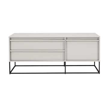 The Albion Sideboard features a stone‑finish body with three drawers, including two stacked drawers on the left and a full‑depth drawer on the right. Finished with black steel legs and built from sustainable materials, it offers durable, stylish storage for modern homes.