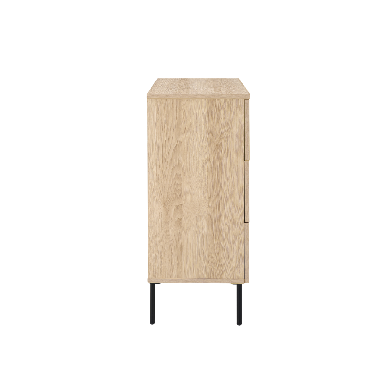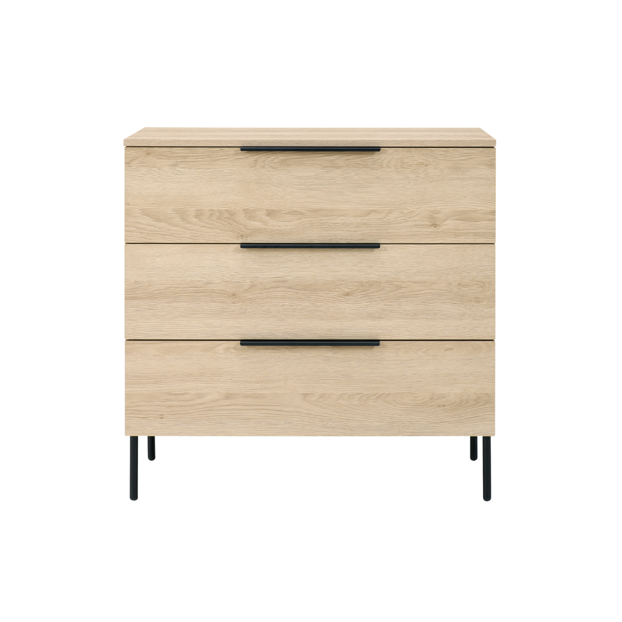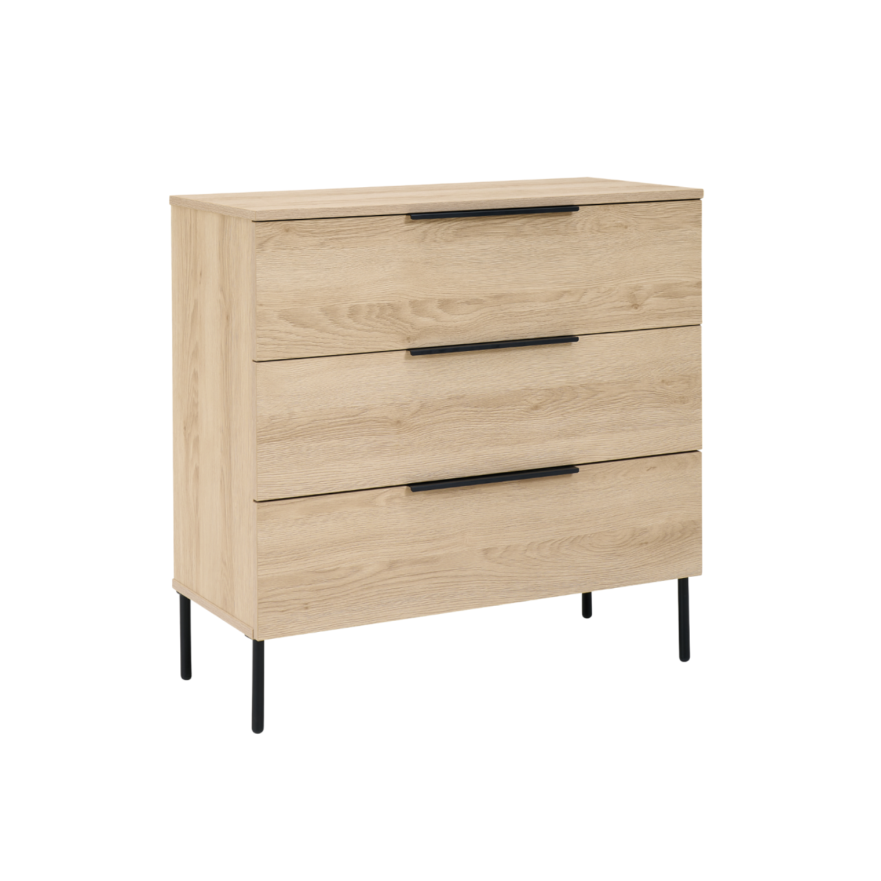 The Luna 3 Drawer Chest features a woodgrain‑effect finish, wide metal lip‑pull handles and ball‑bearing runners for smooth operation. Supported by black steel legs, it’s durable, modern and easy to maintain.