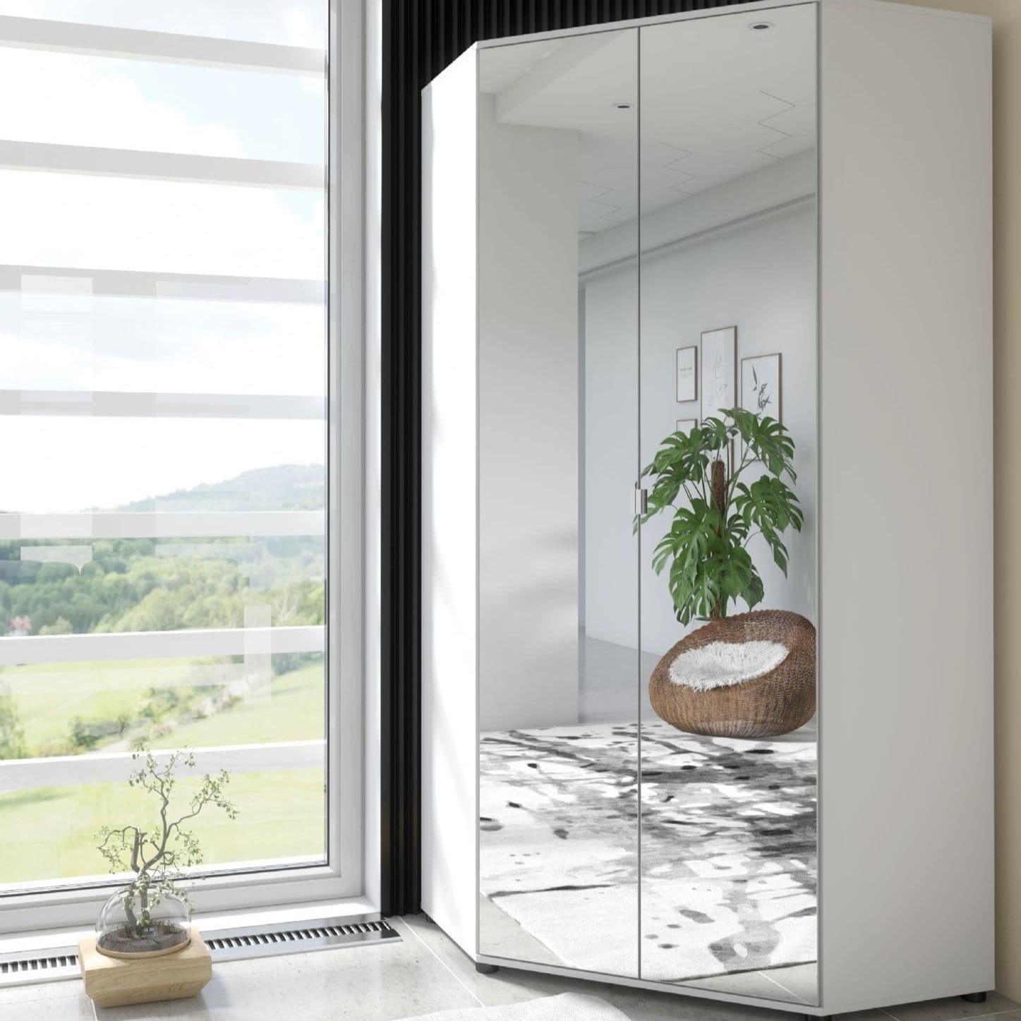 Lydd Corner 2 Door Mirrored Wardrobe – Matt White Finish with Shelves & Hanging Rails
