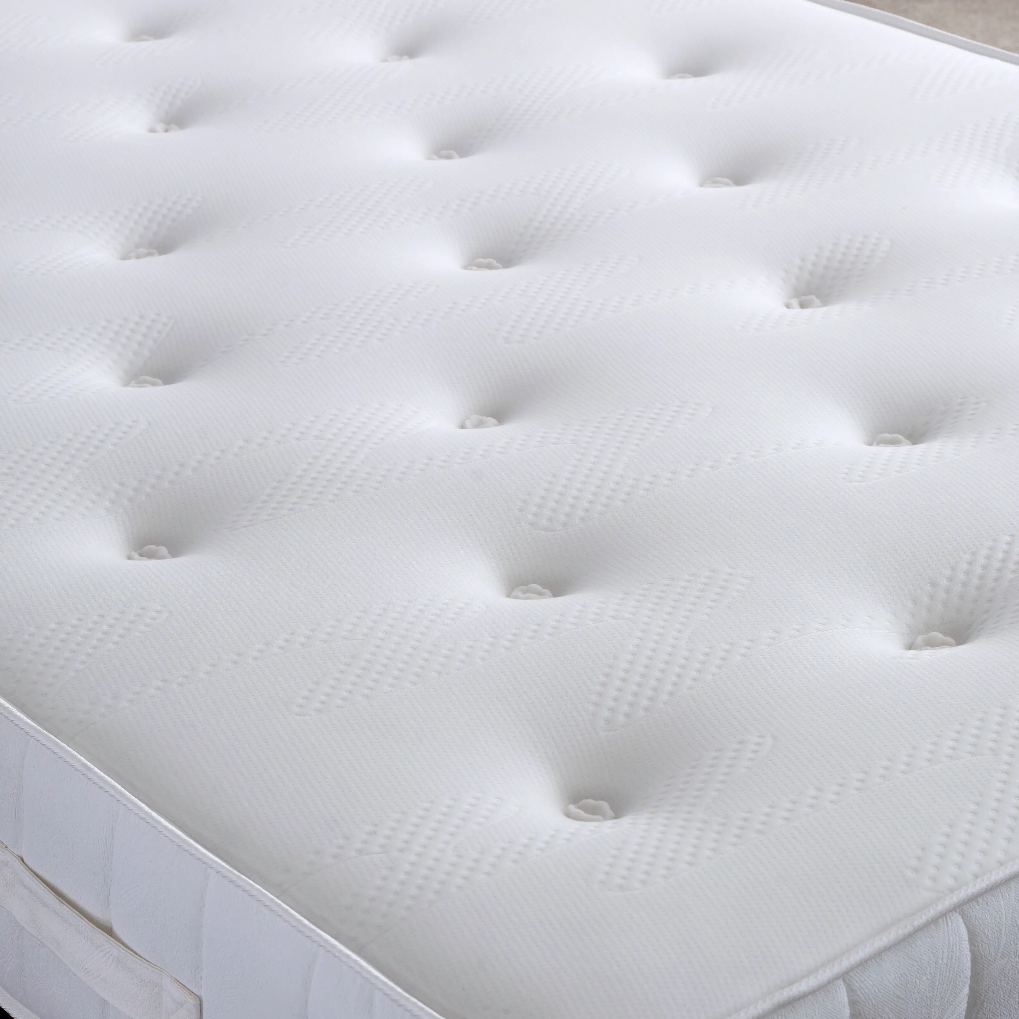 Experience orthopaedic support and memory foam comfort with the Memory Maestro Coil Sprung Mattress – a modern solution for restful sleep. This mattress combines a 12.5-gauge open coil spring unit with visco memory foam, offering firm support and pressure relief. The hand tufted finish secures the polyester fillings, while the stretch fabric cover and vertical border add durability and style. Air vents and horizontal handles improve airflow and ease of rotation.