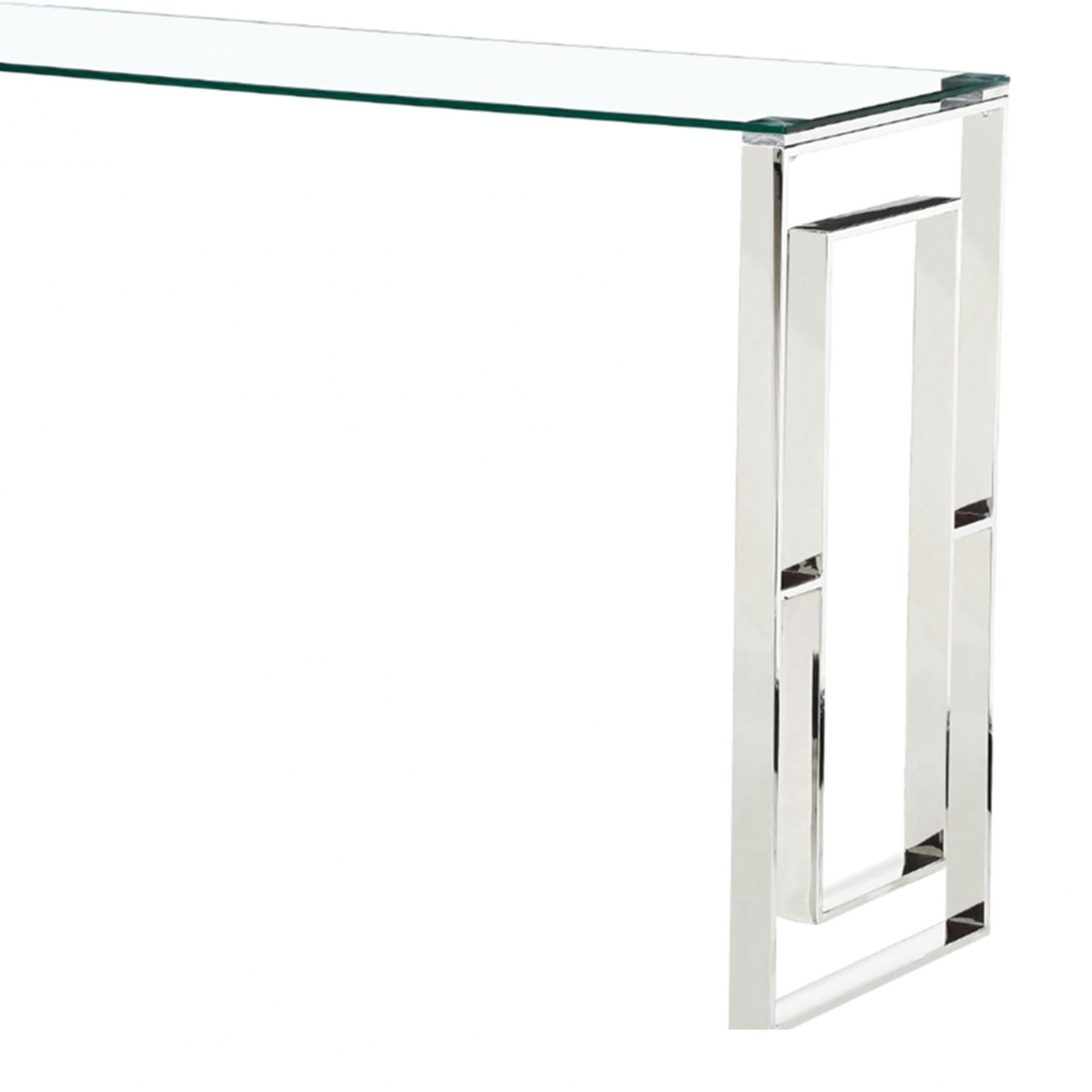 Elevate your interior design with the Memphis Silver Clear Glass Console Table. Its elegant design features a sleek silver frame and a transparent glass top, creating a contemporary and sophisticated look. Perfect for displaying your favorite decor or serving as a functional entryway table.