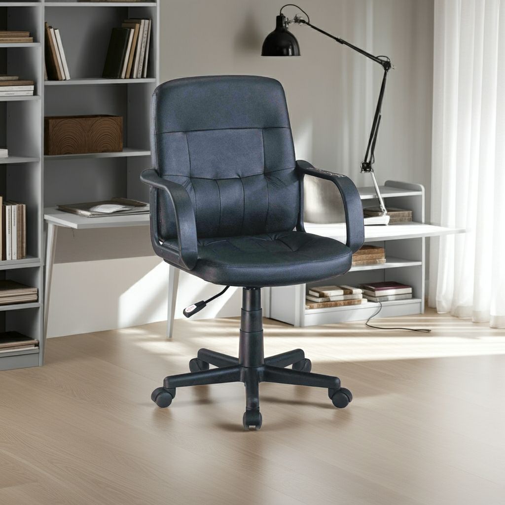 The Mia Office Chair – Black combines minimalist design with ergonomic comfort. Upholstered in bonded leather, it features a gently contoured backrest and seat for all-day support. The nylon base ensures stability, while the adjustable height (900–1000 mm) allows for personalized positioning. With a compact footprint and modern styling, this chair is ideal for both home offices and corporate environments.