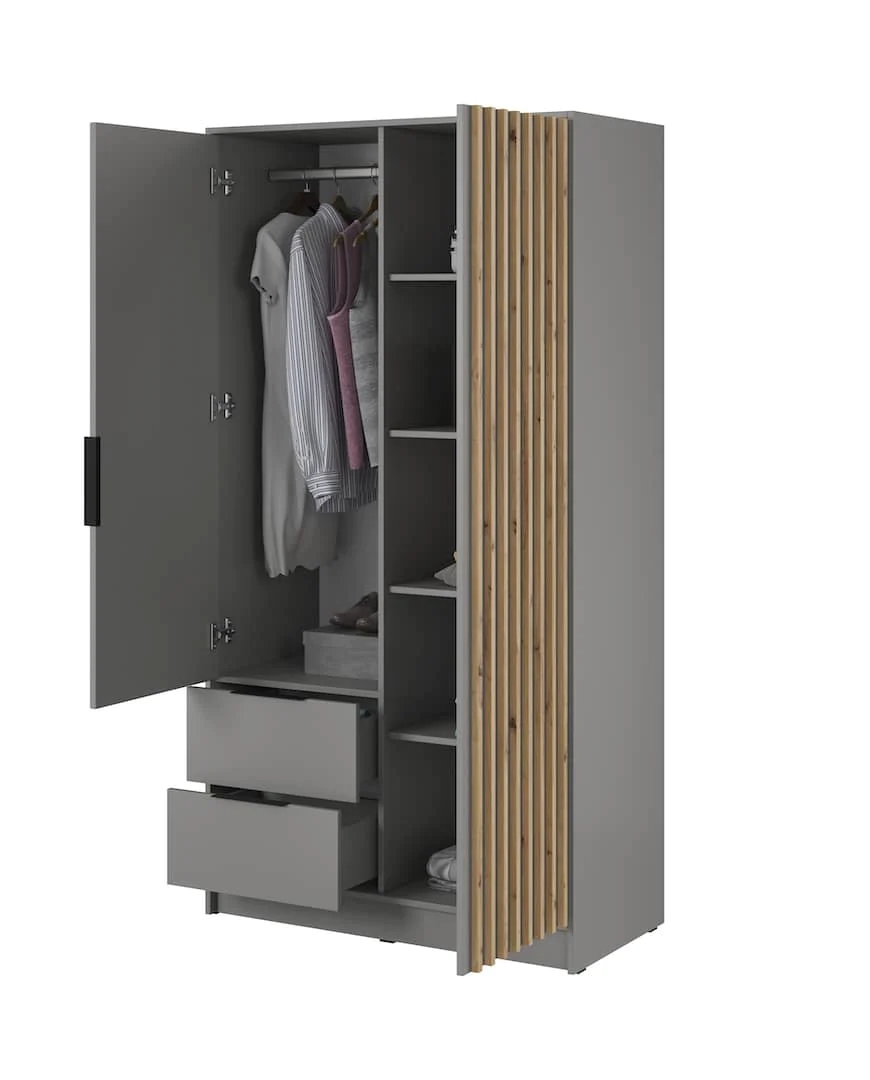Durable and modern, the Nelly two-door wardrobe is design-led, with a stylish mirrored finish that will blend seamlessly into any bedroom. Featuring four shelves, one hanging rail and two drawers for storage, it offers ample storage space yet is compact enough to fit in the small areas.