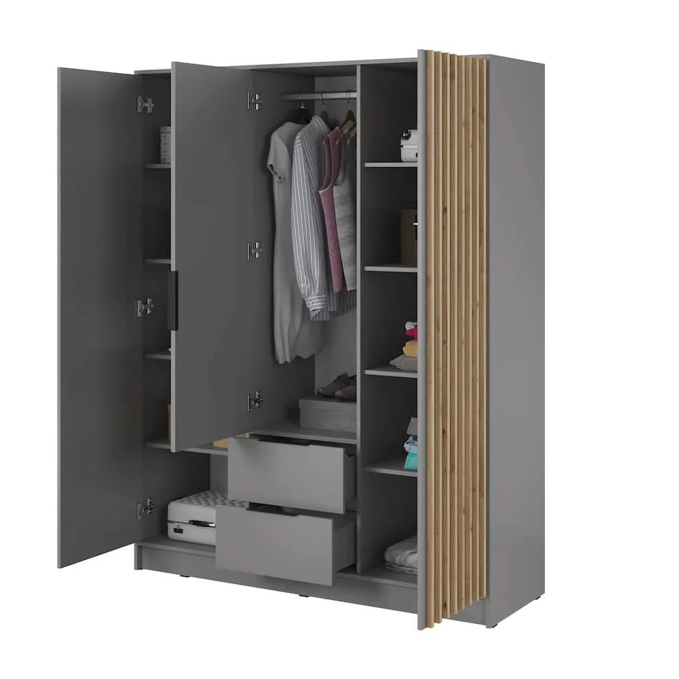 Sleek, elegant and practical. The three-door Nelly wardrobe has everything you need for a well-organized home. With two drawers and eight shelves for storage, it will look great in any bedroom. Available in a range of different colours, it will effortlessly blend in any modern or contemporary decor.
