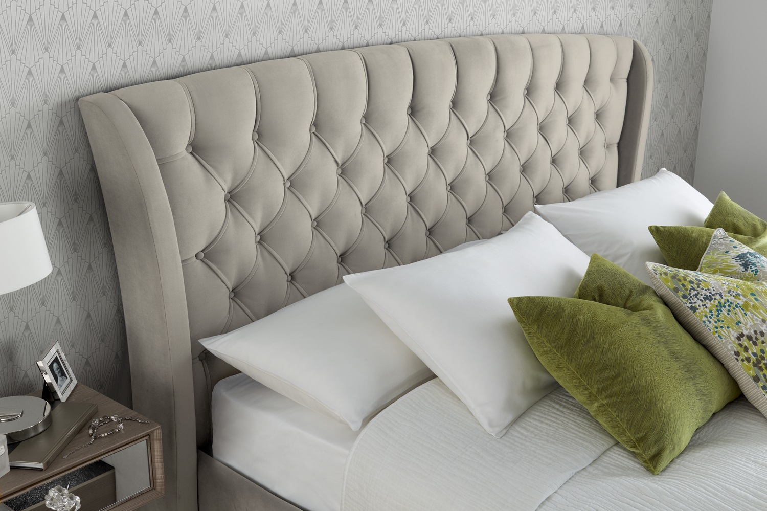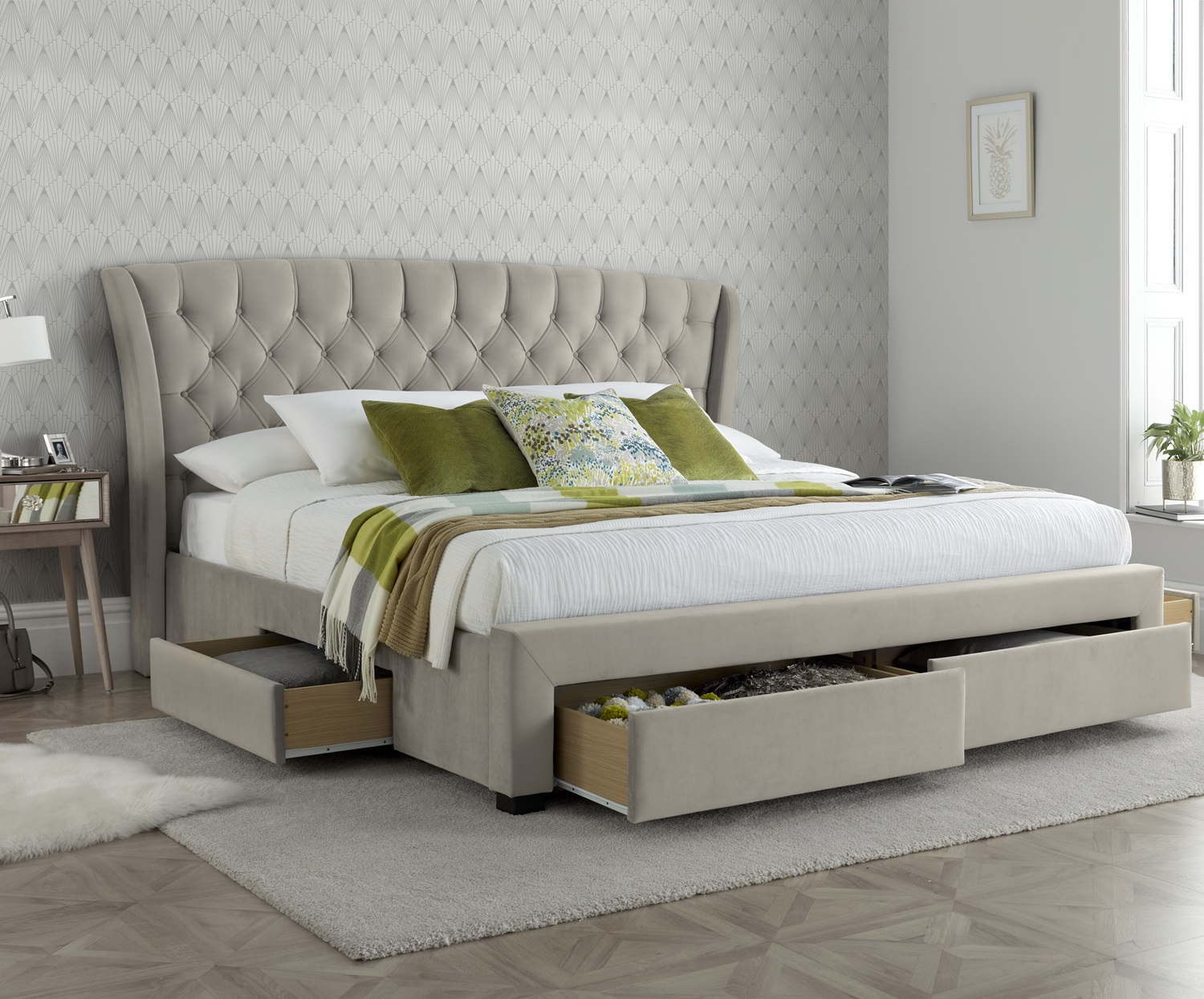 Contemporary yet sophisticated, the Newton Velvet Storage Bed brings a touch of elegance to your bedroom. The bed frame itself comes with 4 discreet and durable drawers that are perfect for all your bedroom essentials. These drawers are wheel free for ease of use. The bed is finished in a beautiful, soft-to-touch velvet fabric and is complete with a deep diamond patterned buttoned headboard. The sprung slatted base provides extra support and comfort for any mattress. This sophisticated and versatile bed offers a fantastic storage solution without compromising on style.